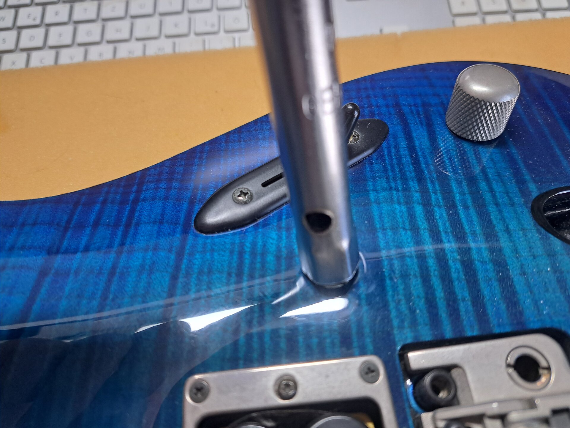 Jetzt beginnt der knifflige Teil. Und obwohl ich normalerweise predige, dass Modifikationen reversibel sein sollten, gestatte ich beim Thema Potibohrung eine Ausnahme von dieser Regel. Ich gehe behutsam vor und nutze einen 10mm-Kegelsenker.