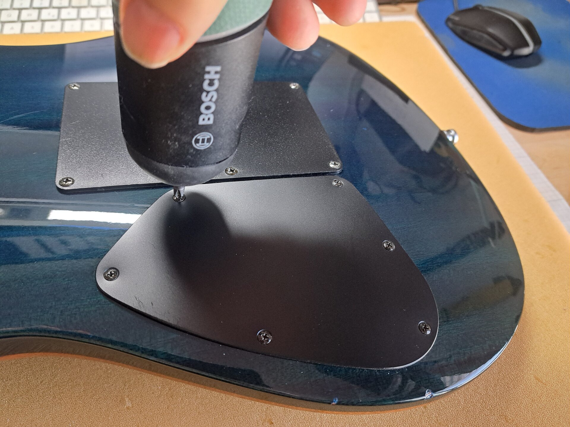 Tipp: Die Schrauben sollen ihr eigenes, sozusagen selbst geschnittenes Gewinde im Holz wiederfinden, damit die Bohrungen nicht ausfransen oder ausleiern. Also besser nicht mit einem Akkuschrauber o.ä. drauflosdrehen, sondern von Hand erst vorsichtig und gefühlvoll nach links drehen und die Schwerkraft walten lassen, bis die Schraube spürbar einen Millimeter nach unten ins Holz fällt, und erst dann ganz normal nach rechts die Schraube anziehen. Aber nur ganz vorsichtig und höchstens handfest, denn sonst überdreht man - was zwar hier beiMakkaroni Mahagoni eher nicht, bei weichem Basswood jedoch sehr leicht passiert.