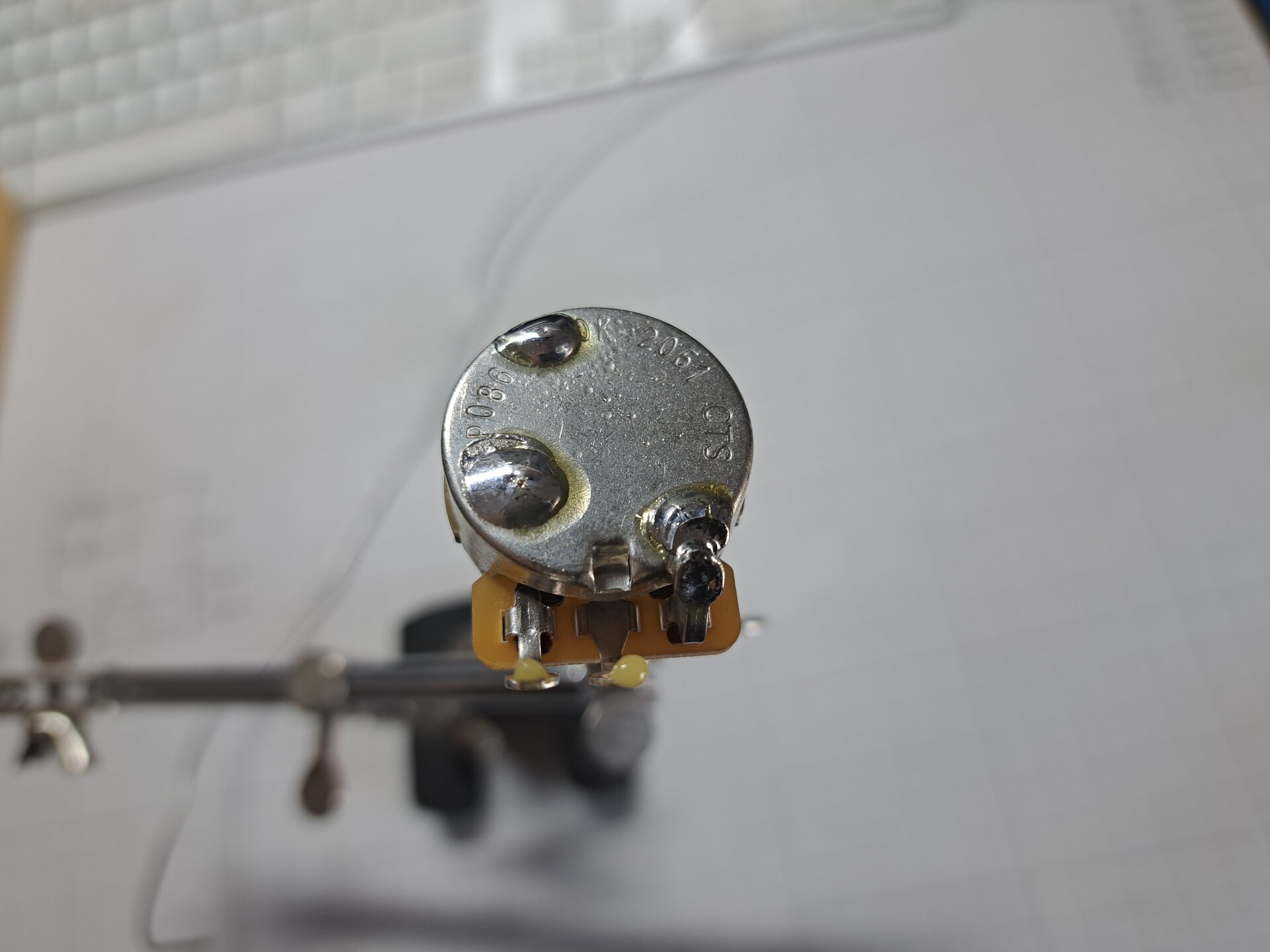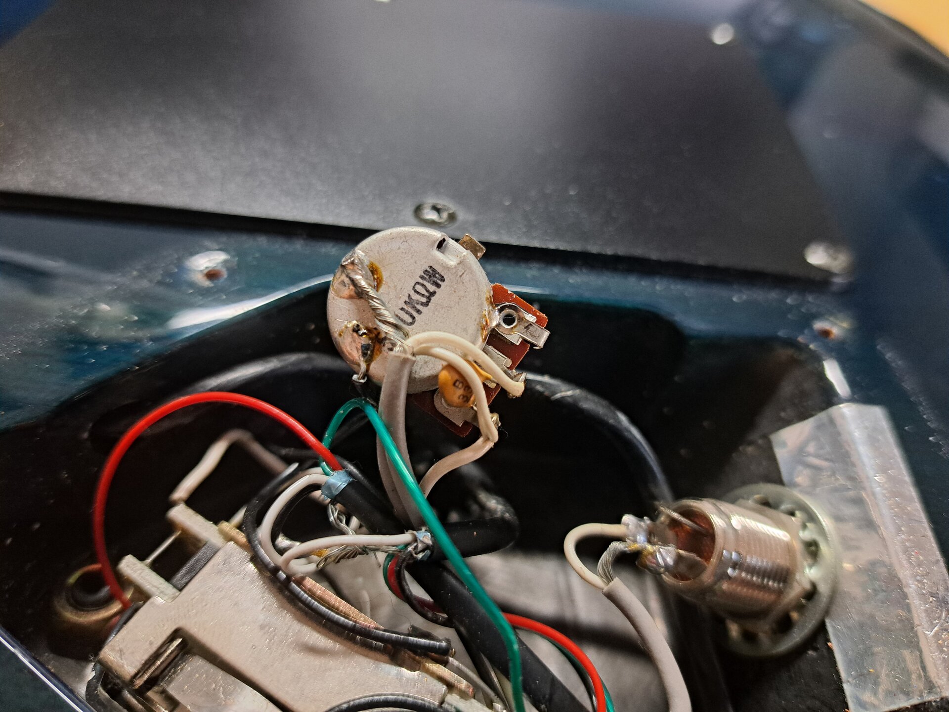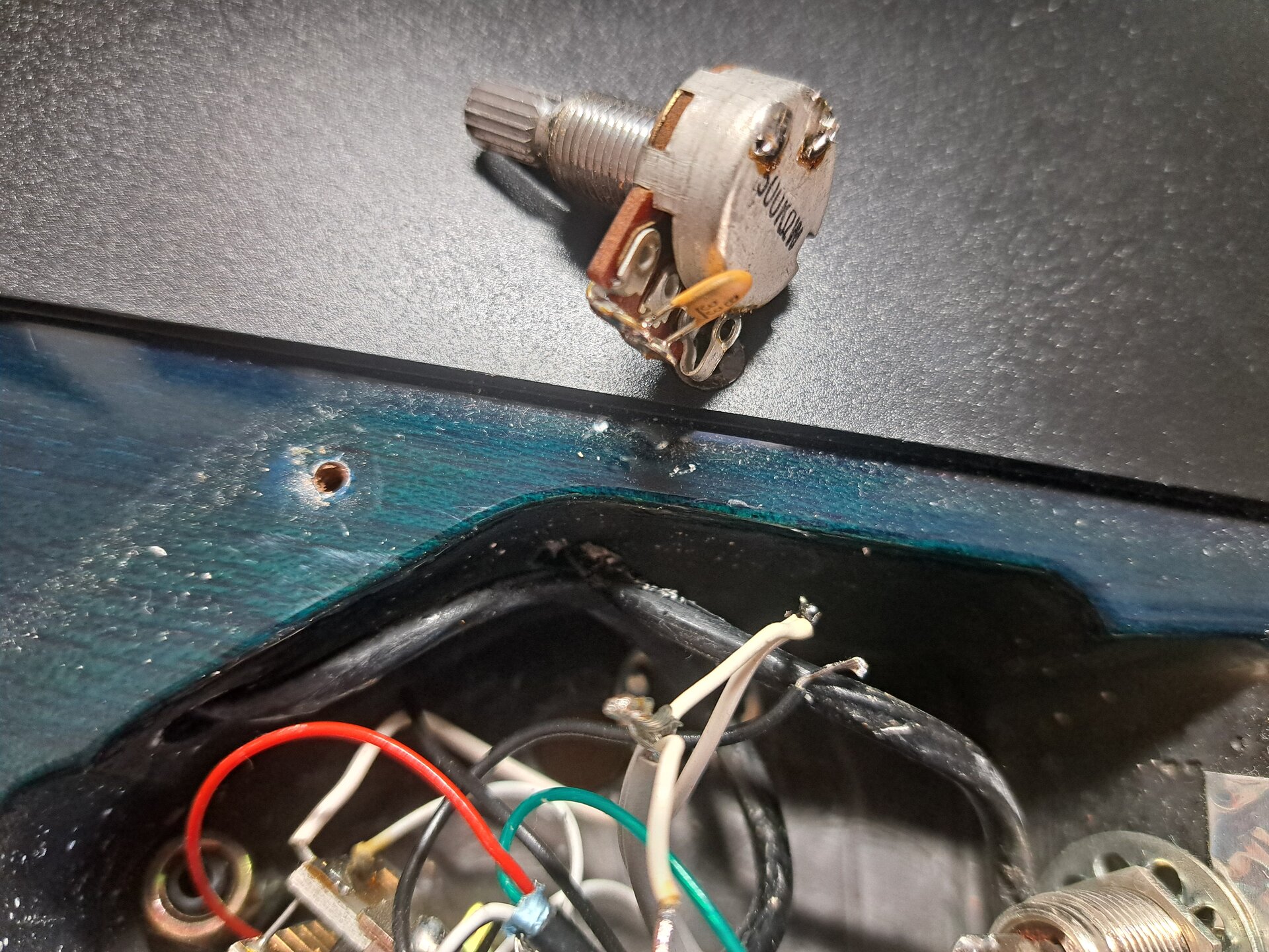 Dann das neue Poti unter die Kabel stopfen, die Zahnscheibe nicht vergessen und oben mit Beilagscheibe und Überwurfmutter montieren. Erst einen kurzen Funktionscheck machen - bestanden - und dann den Potiknopf wieder drauf.
