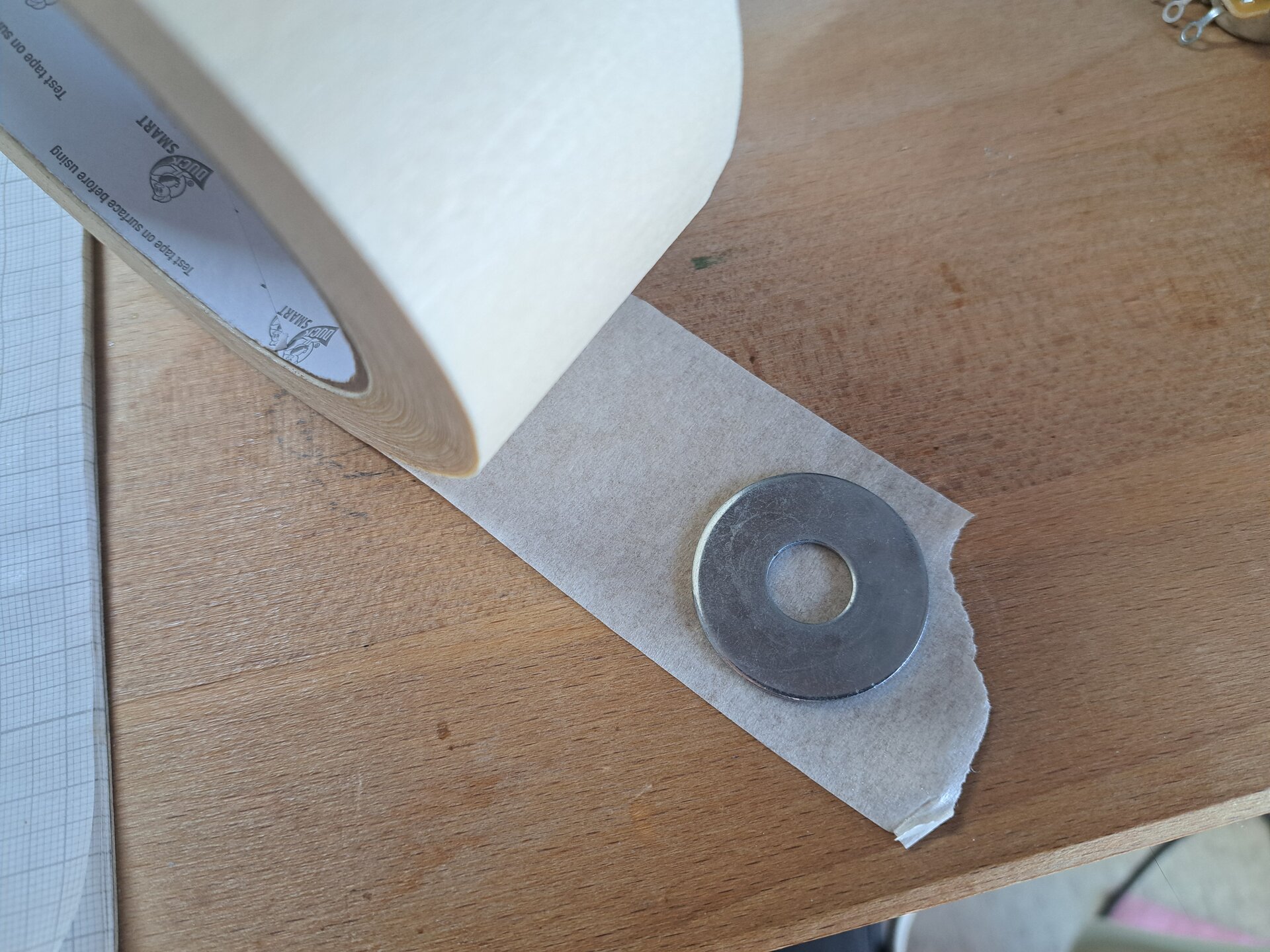 Zum Schutz des Lacks außenrum, falls beispielsweise der Senker verrutscht oder sonstiges Ungemach passieren sollte, nehme ich eine Karosseriescheibe und etwas Flachkreppband. Gebohrt wird mit einem Akku-Bohrschrauber mit sehr niedriger Drehzahl und ganz viel Gefühl.