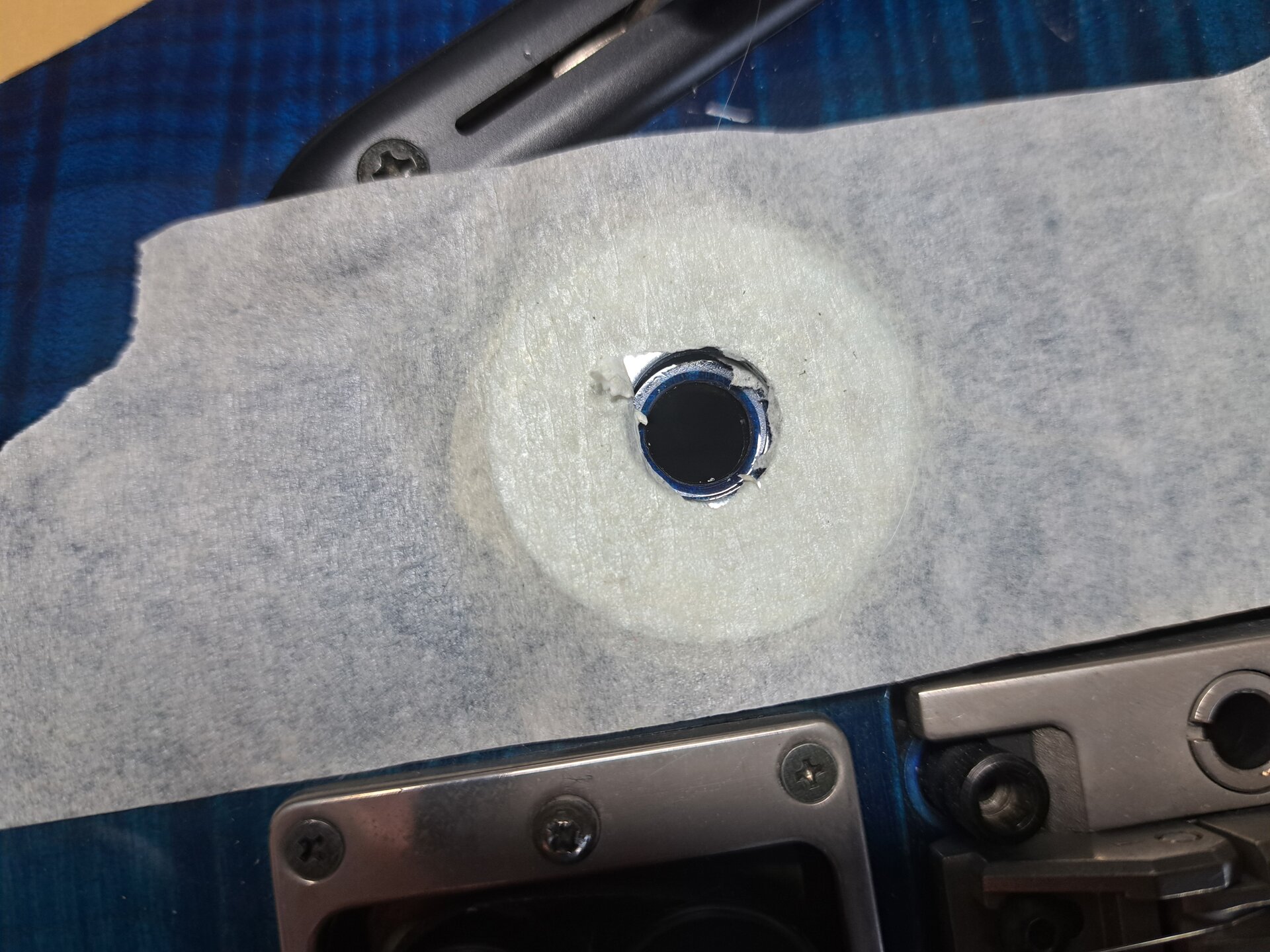Gaaanz leicht ausgefranst ist der Klarlack, das macht mir aber keine Sorgen. Die Stellen verschwinden unter der Beilagscheibe. Der Kratzer rechts von Bohrloch war übrigens vorher schon da, siehe Bilder weiter oben. Vermutlich war der Abstand zwischen Potiknopf und Lackoberfläche zu klein oder er saß schief auf der Achse.