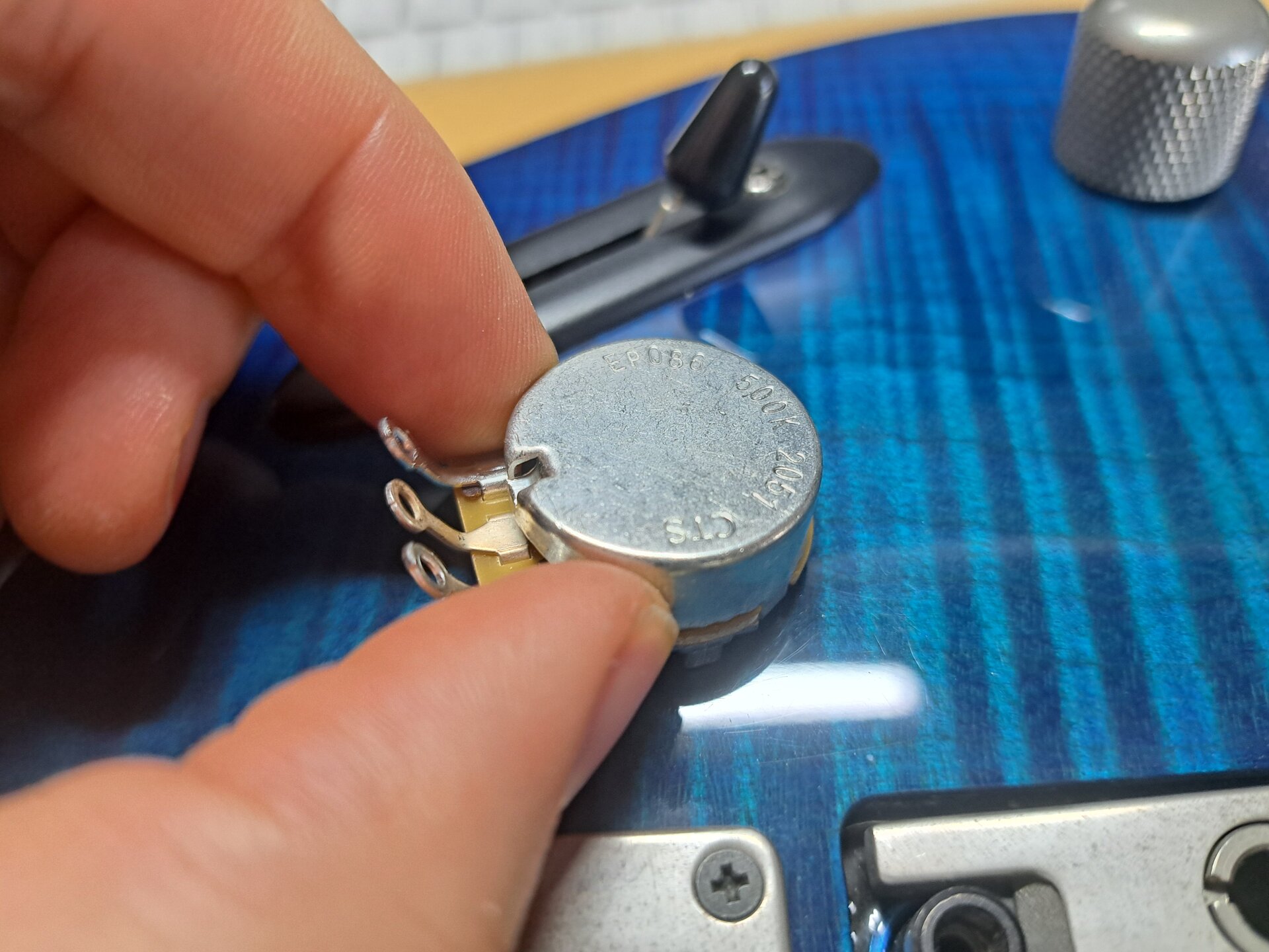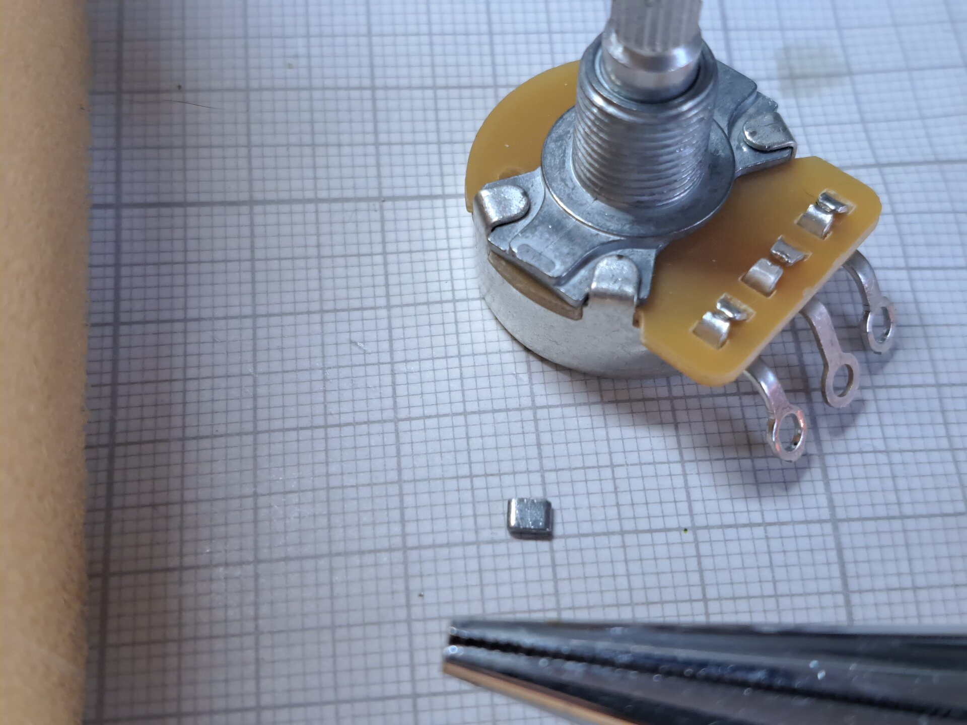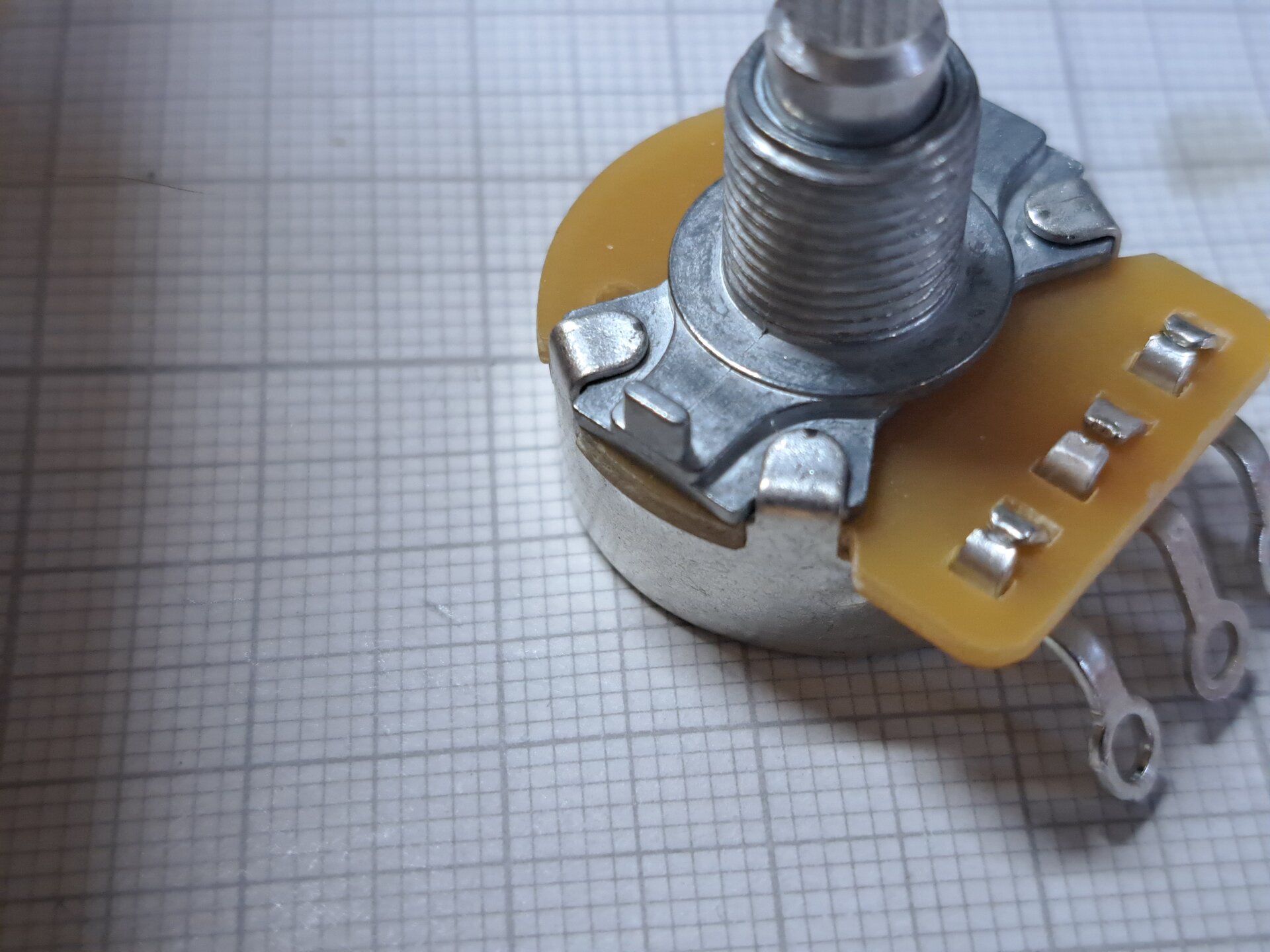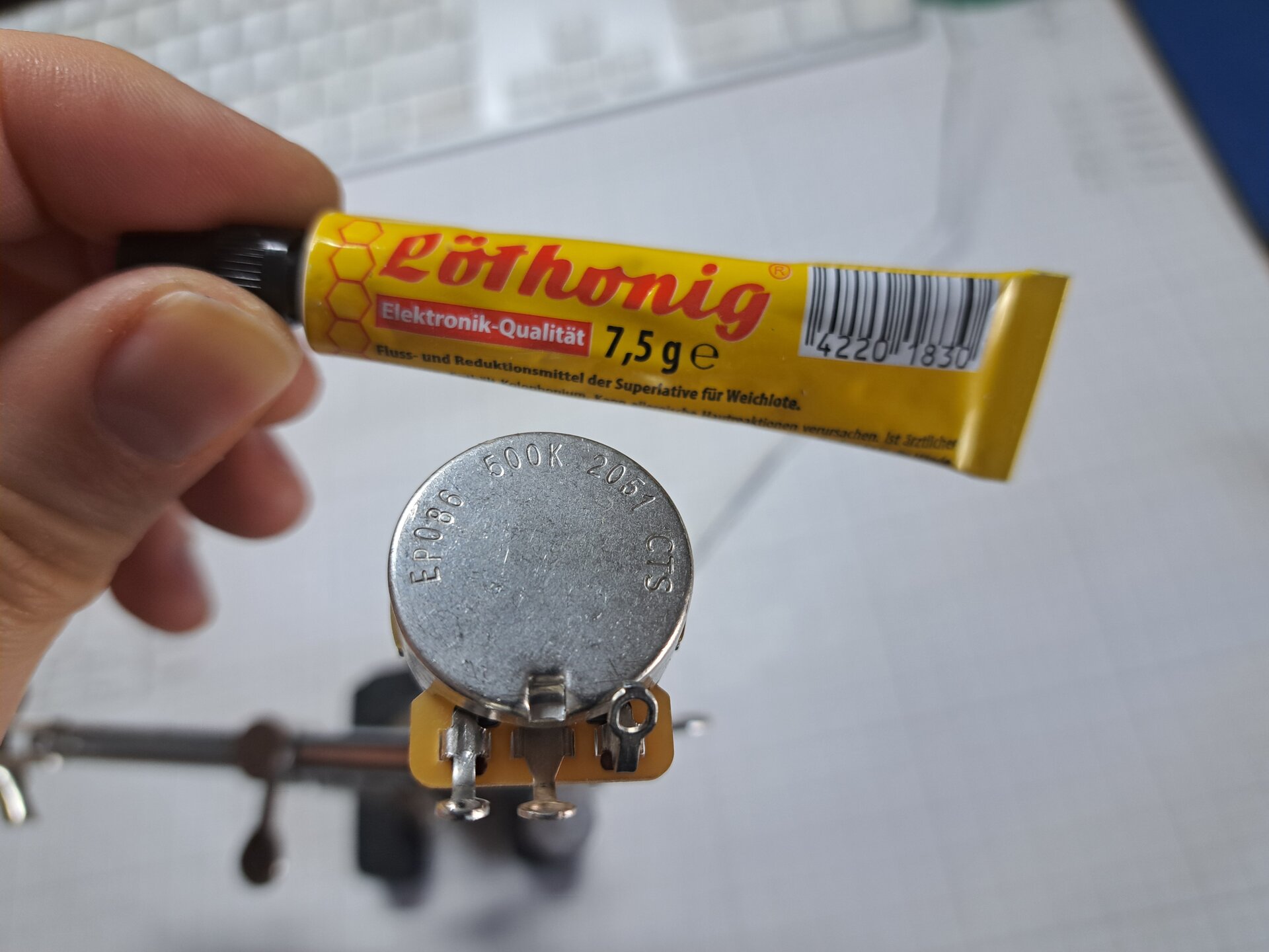 Ich hatte noch eines meiner Lieblingspotis vorrätig - ein CTS 500K Audio Taper. Das Problem ist: Es hat einen Gewindedurchmesser von 3/8" = ungefähr 9,5mm und das verbaute japanische Poti hat ein M8-Gewinde.