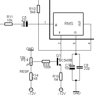 Aufgabe des RMS-Detectors ist es, den Pegel des Signals zu berechnen, genauer gesagt, den Dezibel-Wert des Effektivwerts (root mean square - rms) des Signals. In die Berechnung des Effektivwerts fließt eine Zeitkonstante ein, die sich über das RESP-Potentiometer P3 (Response) beeinflussen lässt.