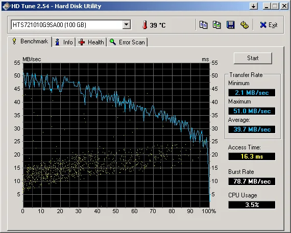 1. Bild Datendurchsatz der eingebauten SATA-HD mit 100GB und 7200U/min, 8MB Cache.