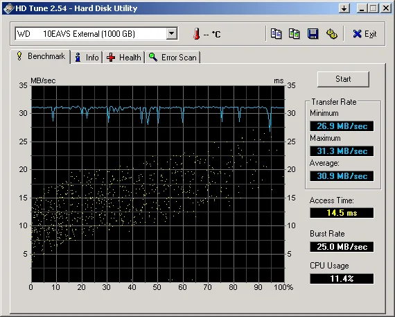3. Bild Datendurchsatz einer via USB angeschlossenen HD mit 1000GB und 7200U/min, 16MB Cache