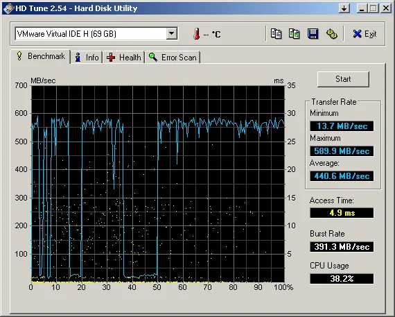 3. Die Datendurchsätze der virtuellen Platte scheinen astronomisch, allerdings mit erheblichen Sprüngen zwischen Minimum und Maximum. Und genau da liegt meines Erachtens das Problem: