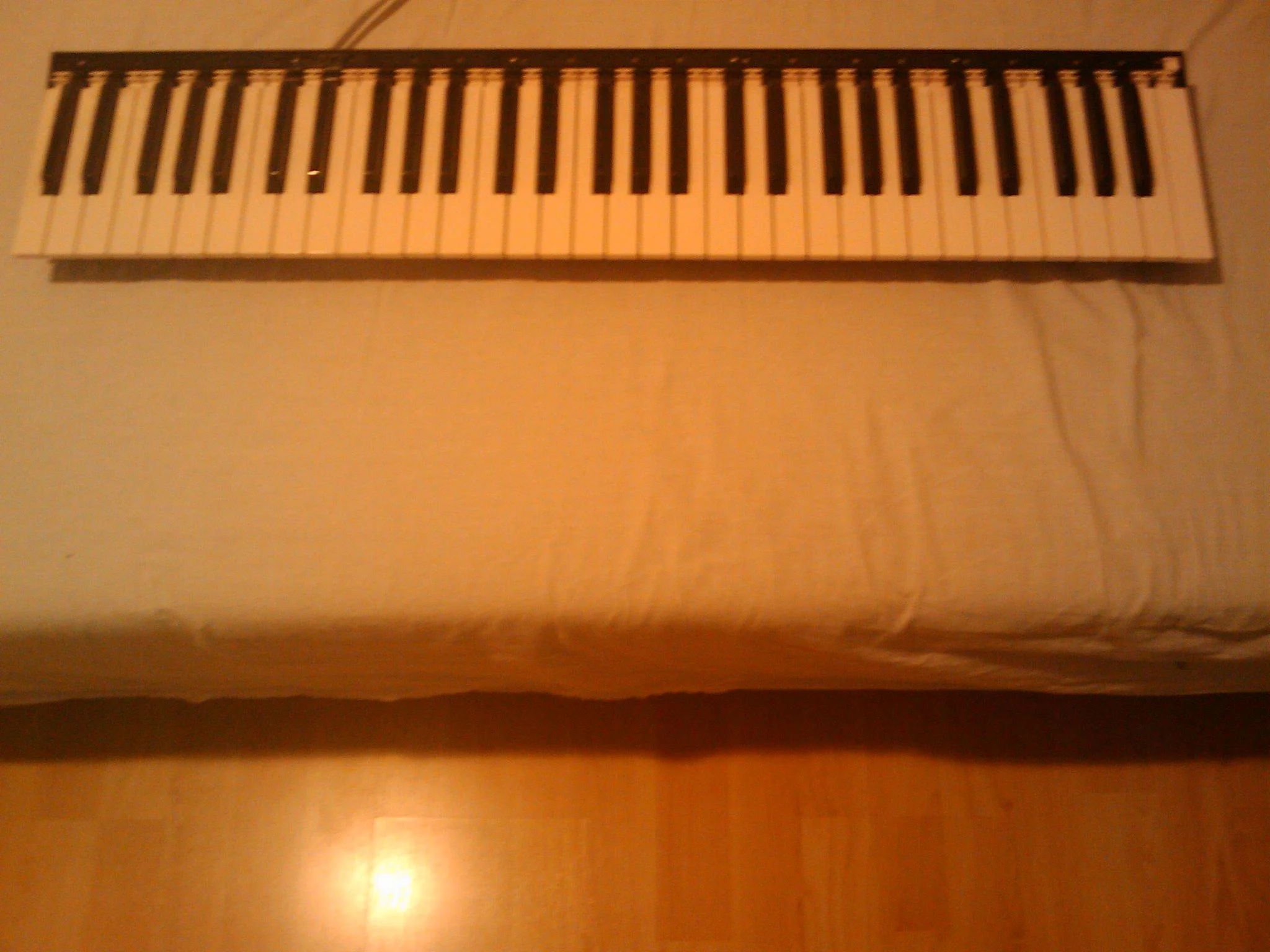 Leider ist auf dem Bild nicht zu sehen, ob sich unterhalb der Tasten noch die lange Platine befindet, die sich vermutlich über die ganze Tastaturbreite ausdehnt.