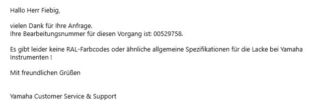 Ich bin ziemlich sicher, dass Yamaha-intern ein Farbcode für jede verwendete Farbe existiert. Du kannst bei Yamaha ja mal anfragen, ob man Dir die exakte Farbmischung -im Idealfall die RAL-Nummer(n)- mitteilt.Hat Yamaha spezielle Farbcodes für das Schwarz?