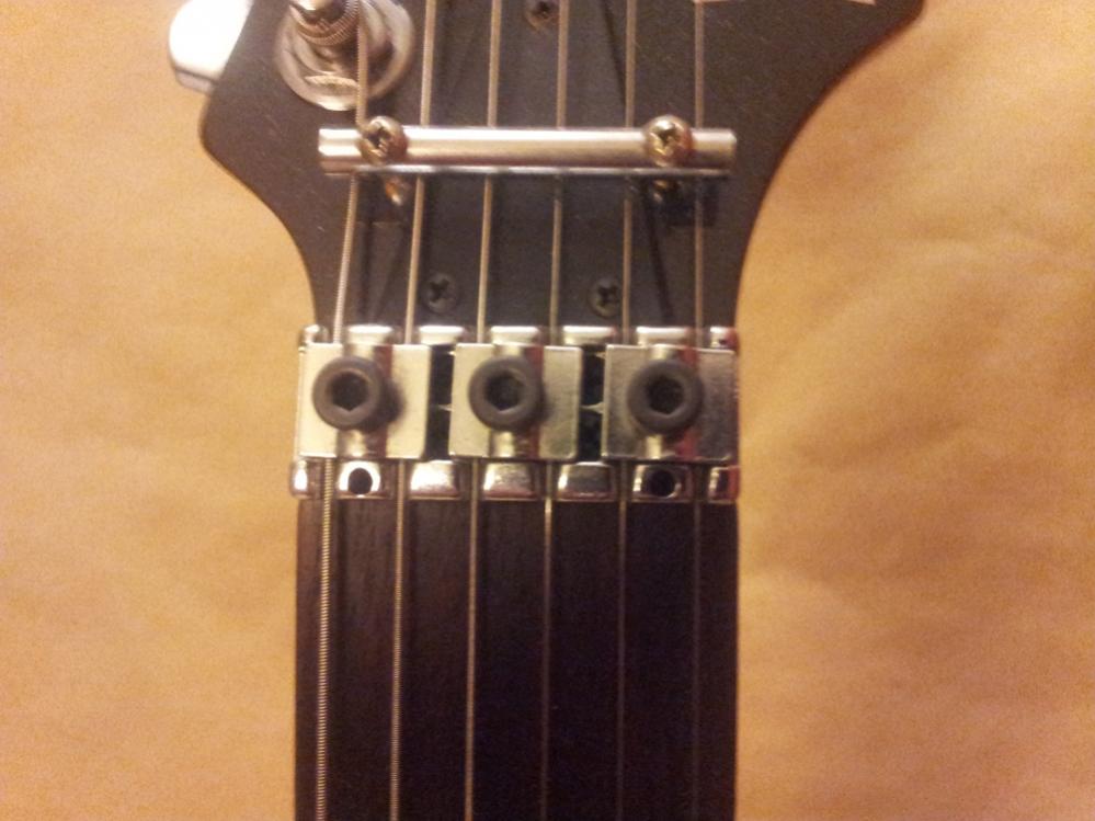 Floyd Rose typisch hat sie Sattelklemmen, mit Imbusschrauben. Yamaha hat ein System das erlauben soll bei Klemmsätteln die Sattelhöhe einzustellen. Sieht für mich so aus, als wäre das hier verbaut.