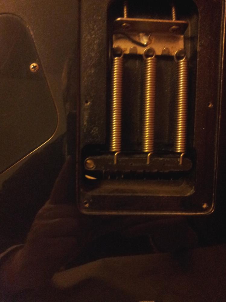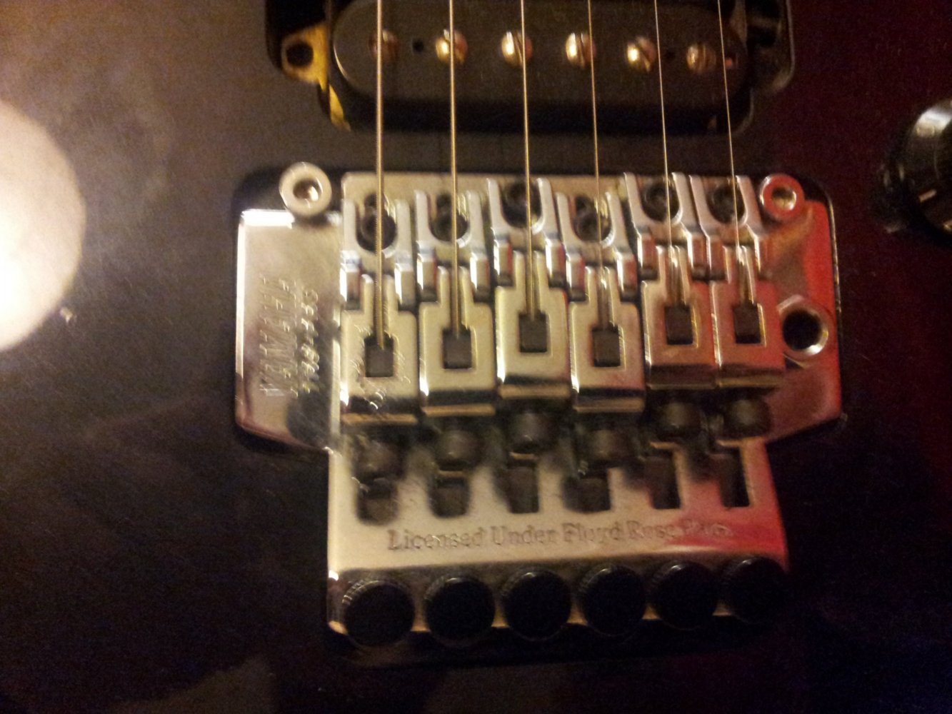 Auf dem Vibrato steht Yamaha TRS-PRO und Licenced by Floyd Rose. Es ist noch stimmstabil, das war einer meiner größten Sorgen bei diesem Kauf. Die Sättel für hohe e und h-Saite haben leichte Kerben, die sich bei Bendings in hohen Lagen bemerkbar machen, die werde ich noch behandeln müssen. Der Vibratohebel ist nicht zum stecken, sondern hat ein Schraubgewinde. Damit kann ich den Hebel entweder fester einstellen als mir lieb ist (fällt nicht mehr von selber in seine Ruheposition), oder ich muß micht damit abfinden, daß er leicht locker sitzt und mich bei subtilem Vibrato so behindert. Allerdings gibt es im Sustainblock auf unter dem Tremolohebel noch eine Schraube. Vielleicht kann man damit etwas einstellen und das Problem besser in den Griff bekommen?