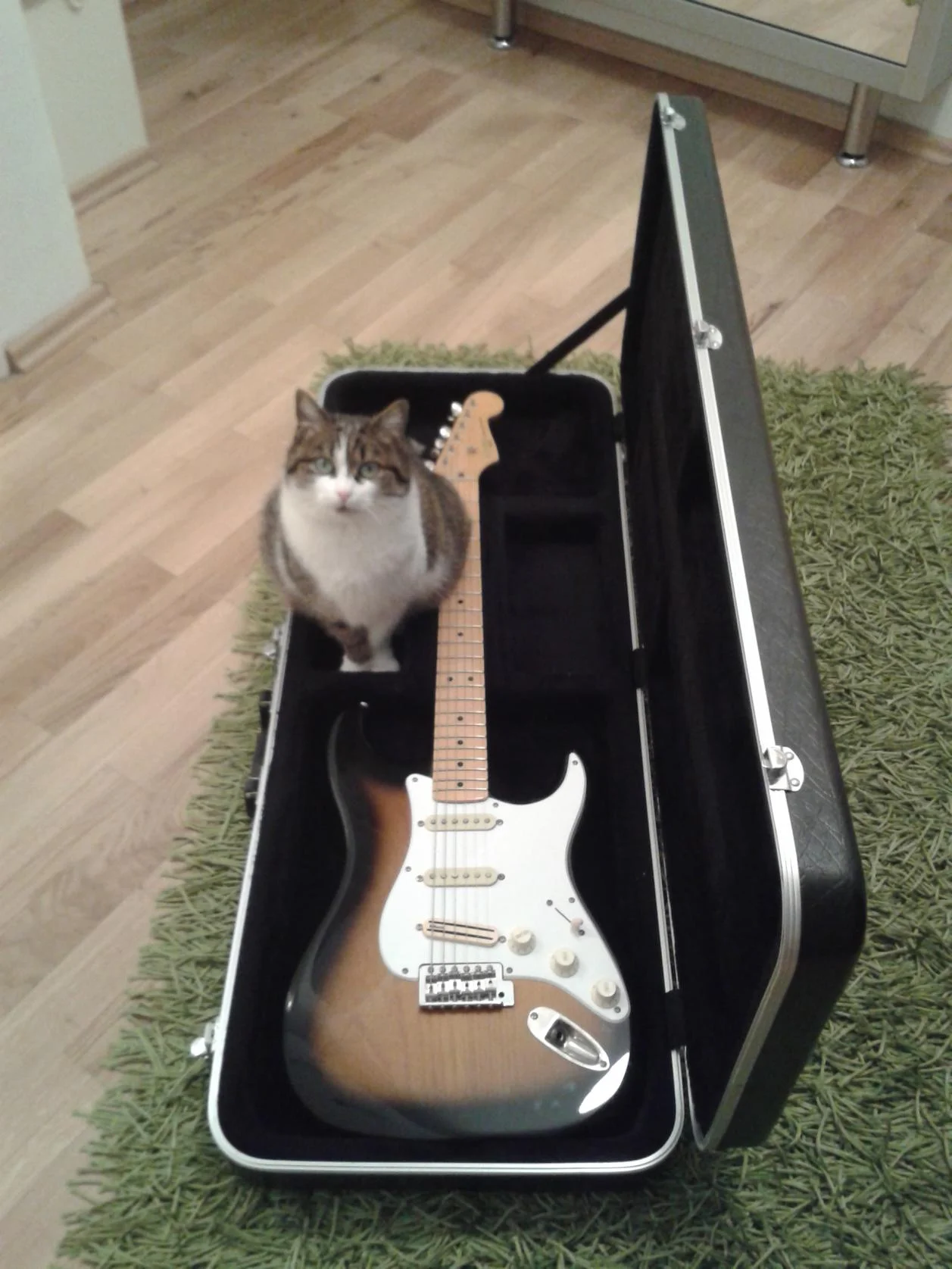Mein Kater liebt Gitarrenkoffer, die sind so schön flauschig. Das was drin liegt (in dem Fall die Strat), stört doch eher. 🙂Unsere Schäferhündin Fossy ist ein Fan von Gibson.