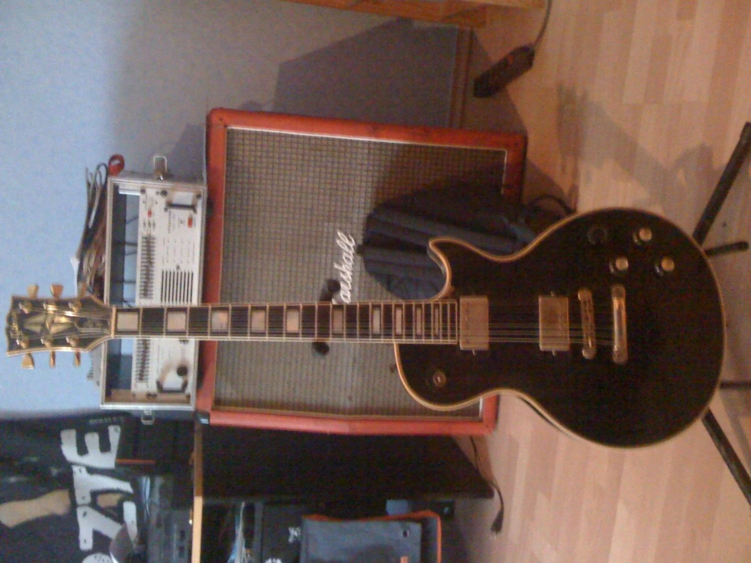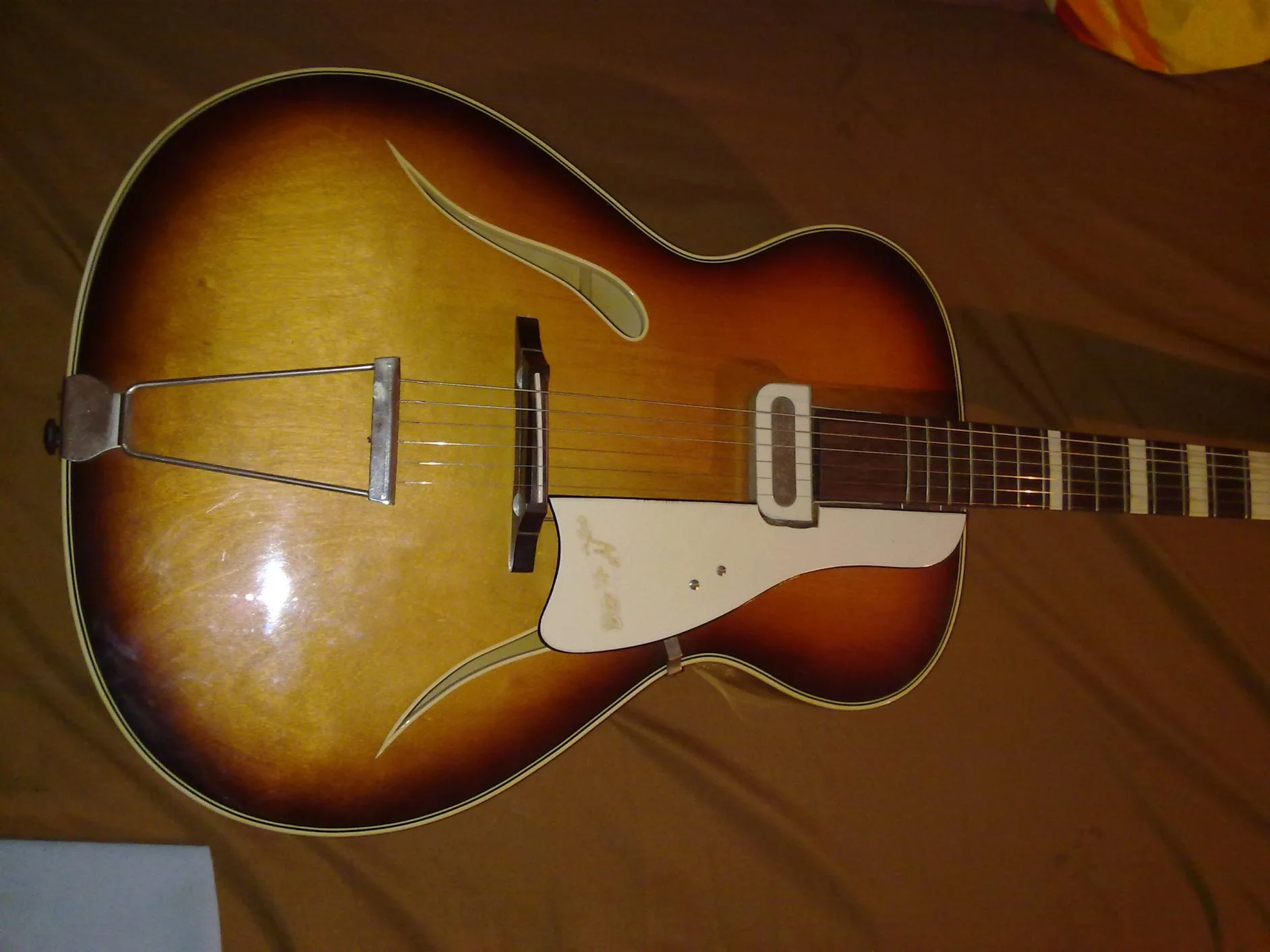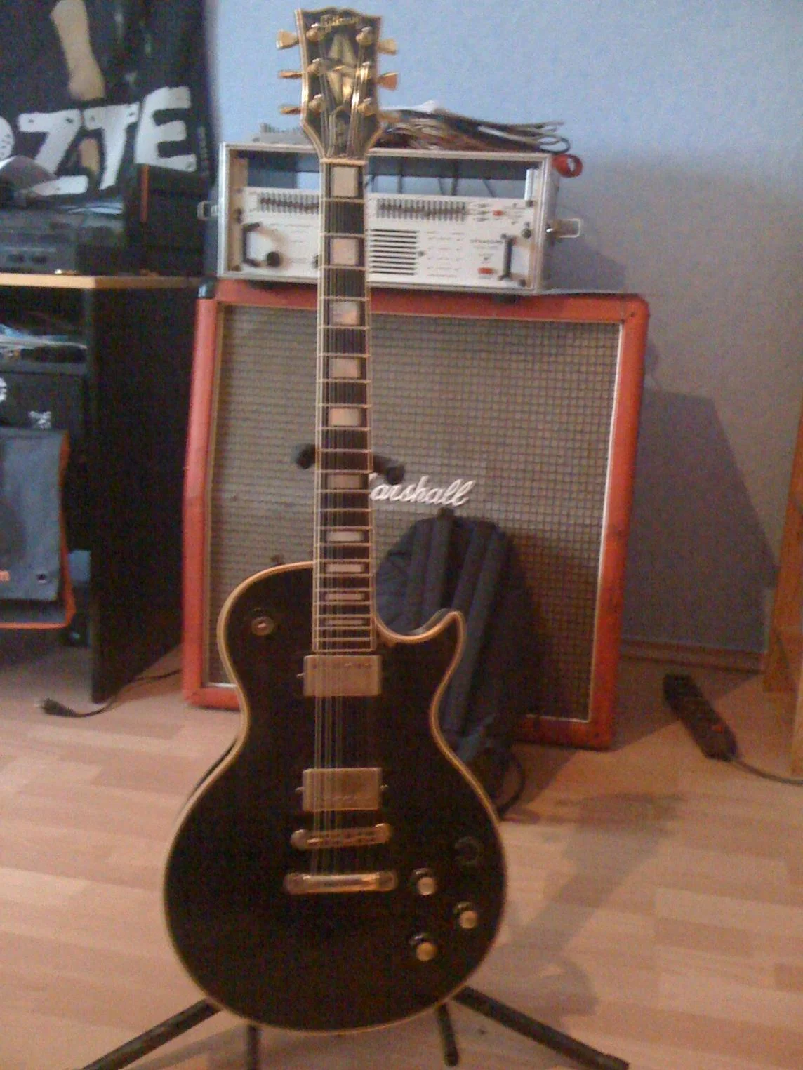 Habe absolut keinen Schimmer, was das für ein Mopped ist, der Schriftzug auf dem Schlagbrett ist leider auch schon ab. Der Anschluss für den Tonabnehmer ist keine normale Klinke, sondern ne Nummer kleiner irgendwie. Auf der Kopfplatte steht auch nischt. Bespielen lässt sie sich auch nicht, da der Hals total verzogen ist und die Saitenlage furchtbar. Aber optisch macht sie bisschen was her und dient bei mir als Deko.