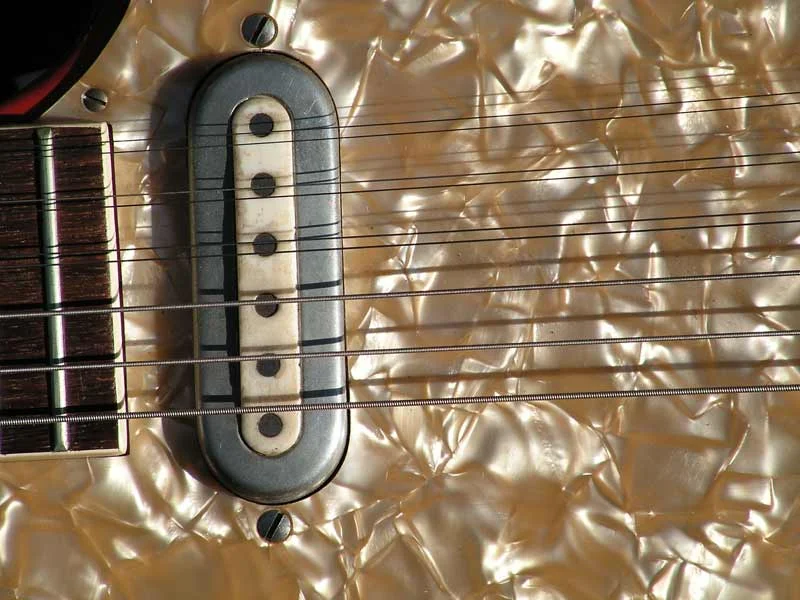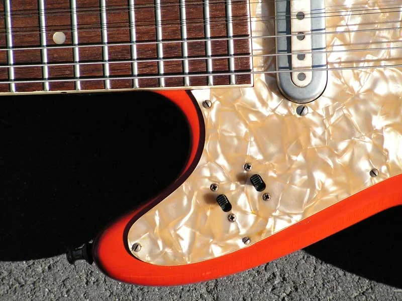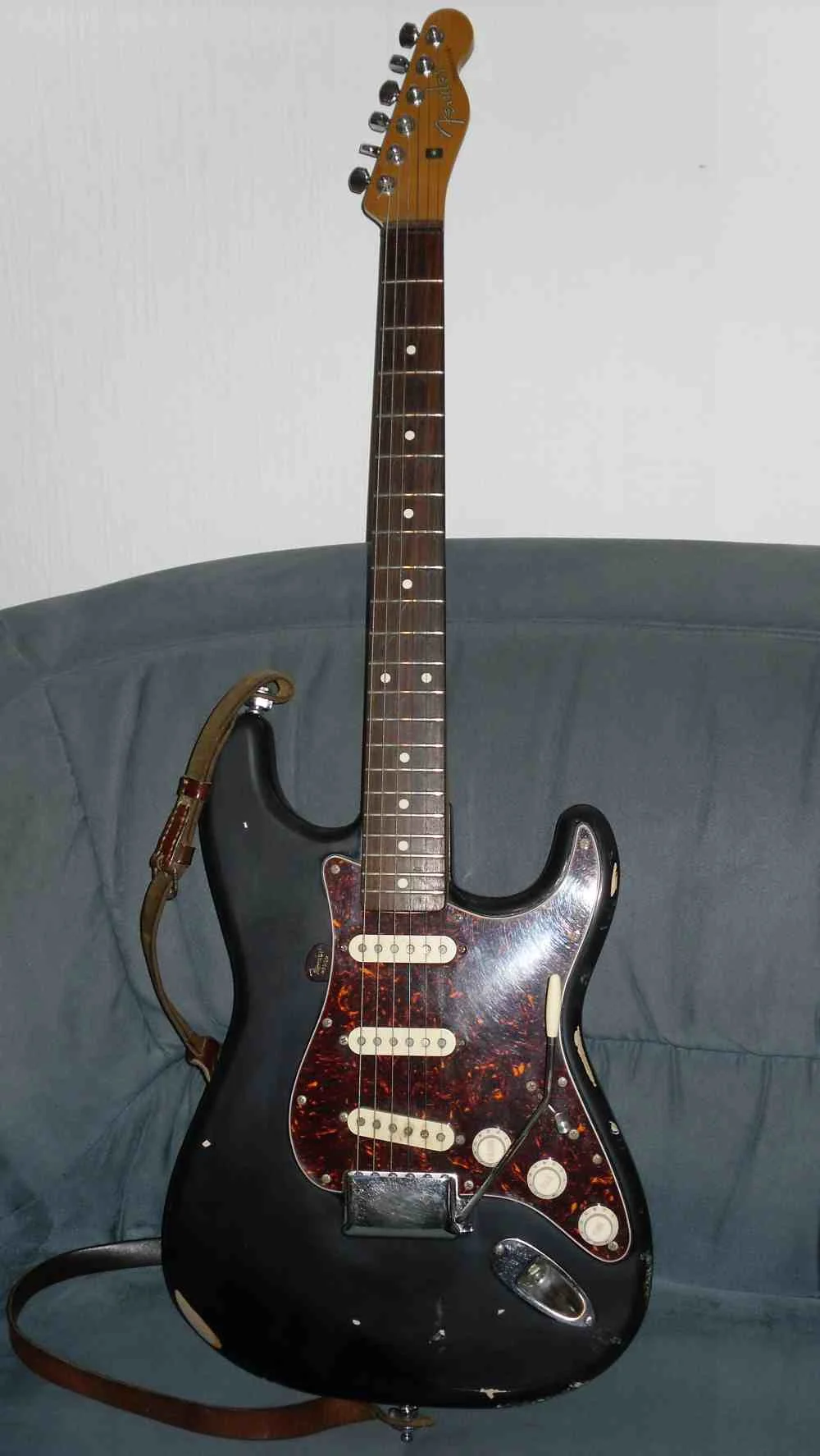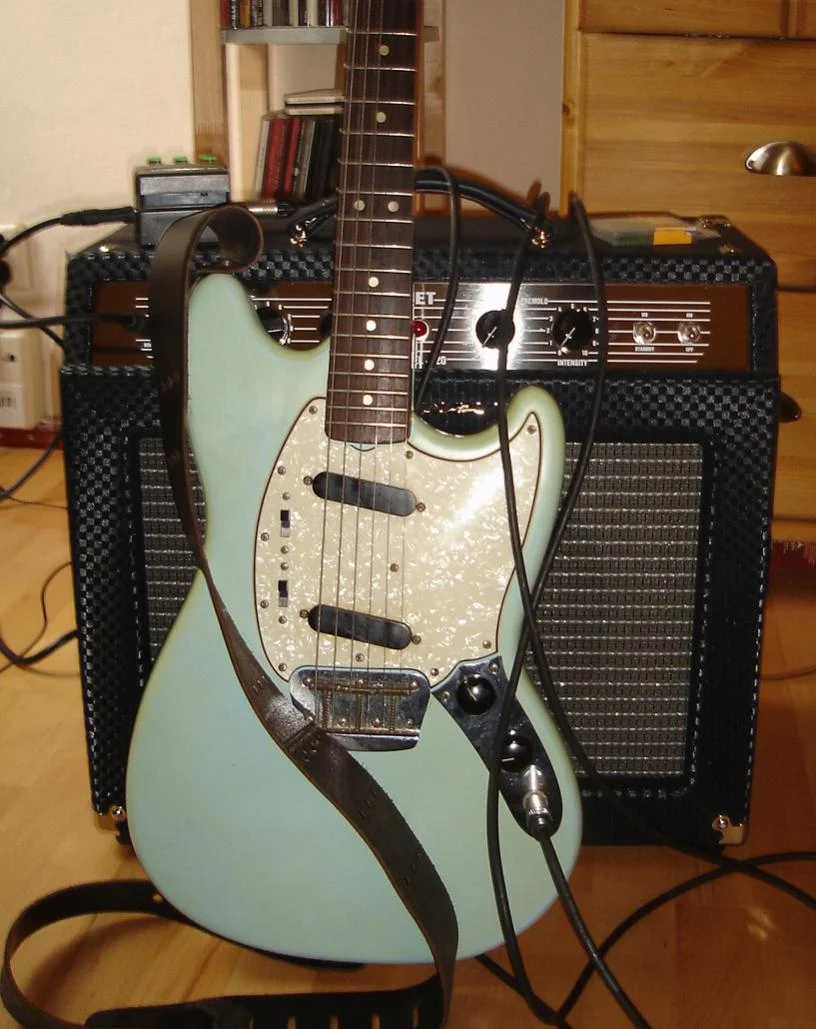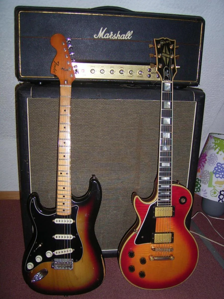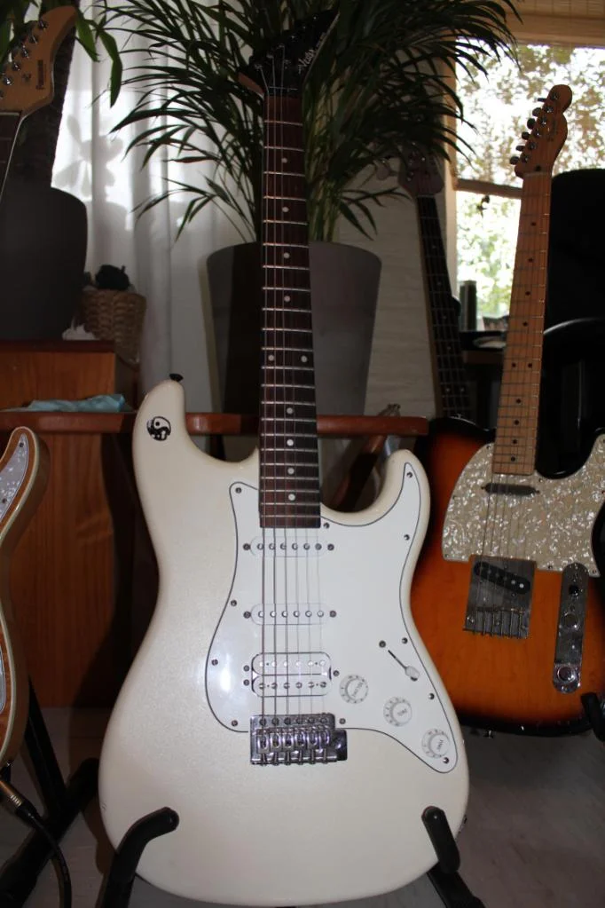 Hier eine meiner Fender-Gitarren. Habe sie vor etwa 32 Jahren gebraucht gekauft (Es gab leider keinen Koffer dazu...). Daten dazu weiß ich nicht. Habe irgendwann den original Stratocasterhals getauscht gegen einen Telecasterhals, weil dieser flacher und besser bespielbar ist. Auch die original Wirbel habe ich runter geschmissen und geschlossene Schaller-Mechaniken montiert. Klingt geil die Kleine und ist ein gutes Gebrauchsinstrument.