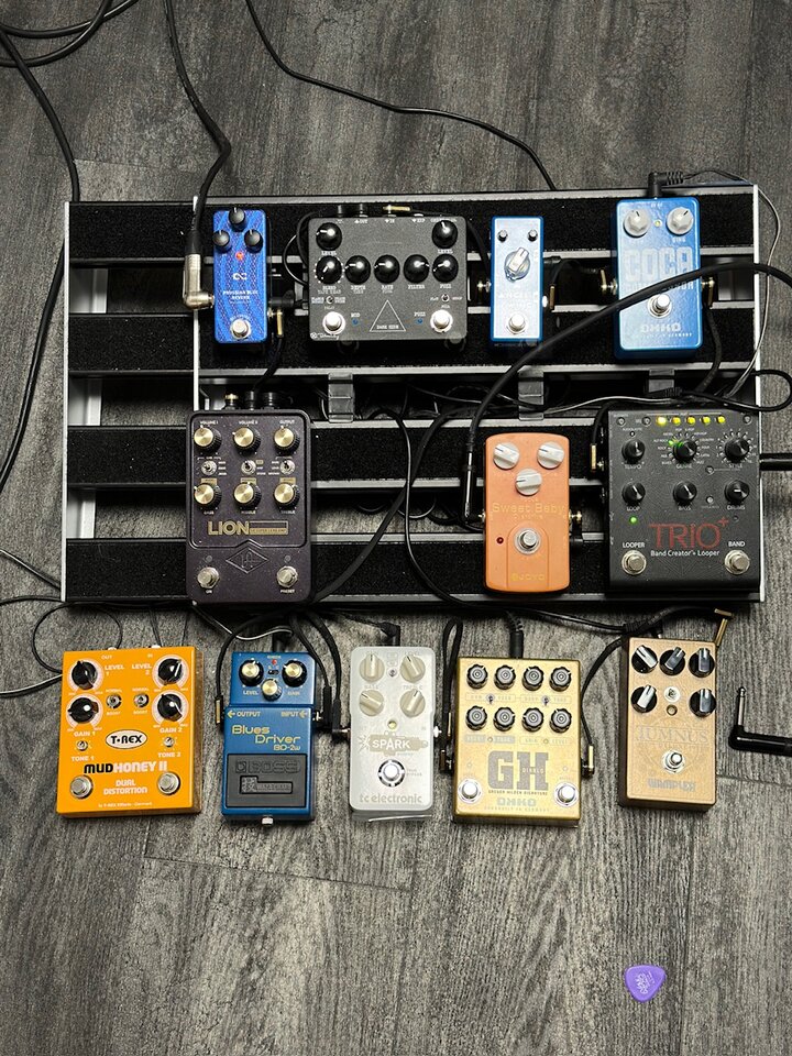 Ibanes TS, Valeton Katfish AutoWah, Source Audio envelope filter, mooer solo distortion, mooer EchoVerb, mooer ShimVerb.