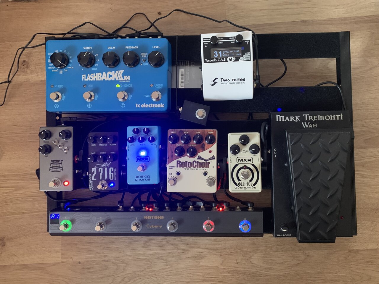 Guten Morgen...Zwischen die Füße hab ich eine 19" Blende https://www.aweo.de/Adam-Hall-872215-U-Rackblende-1-HE-Stahl-fuer-12-x-XLR um 2 Einheiten gekürzt und festgeklemmt. So sind alle nötigen Anschlüsse sauber aufgelegt. Der erste Eingang ist noch frei - da kann anstelle der Funke über den A/B eingestiegen werden. der zweite A/B schickt das Signal final an den VOX VT40x oder den Marshall Haze15. also genügend Auswahl....
