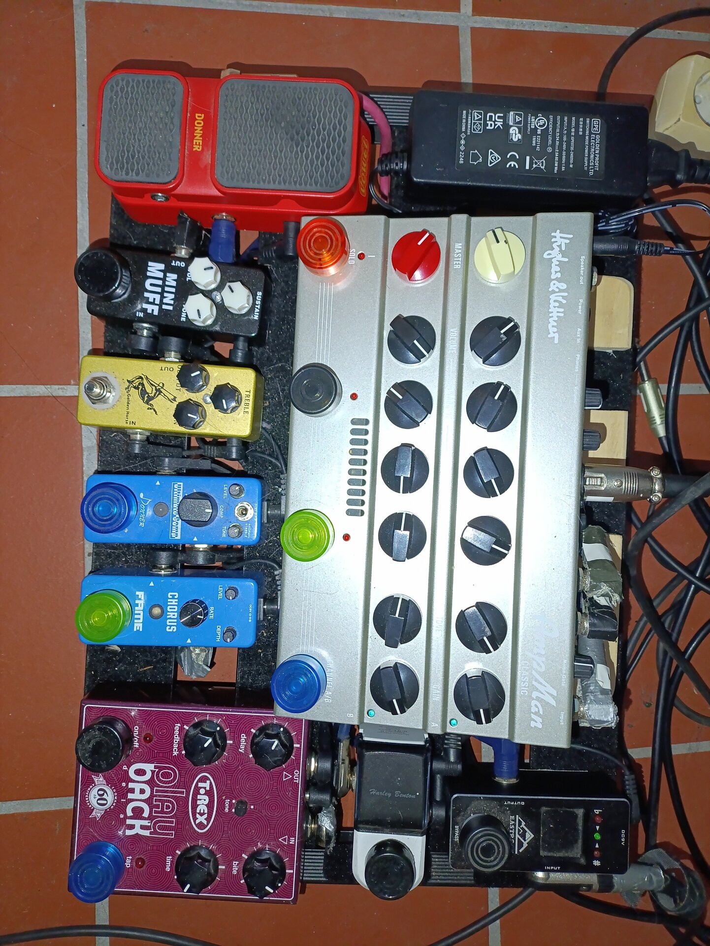 Das Board mit dem Amp1 spiele ich in der Band, Strom kommt vom Voodoo Labs 4x4. Wir proben mit In-Ear und mit E-Drums.