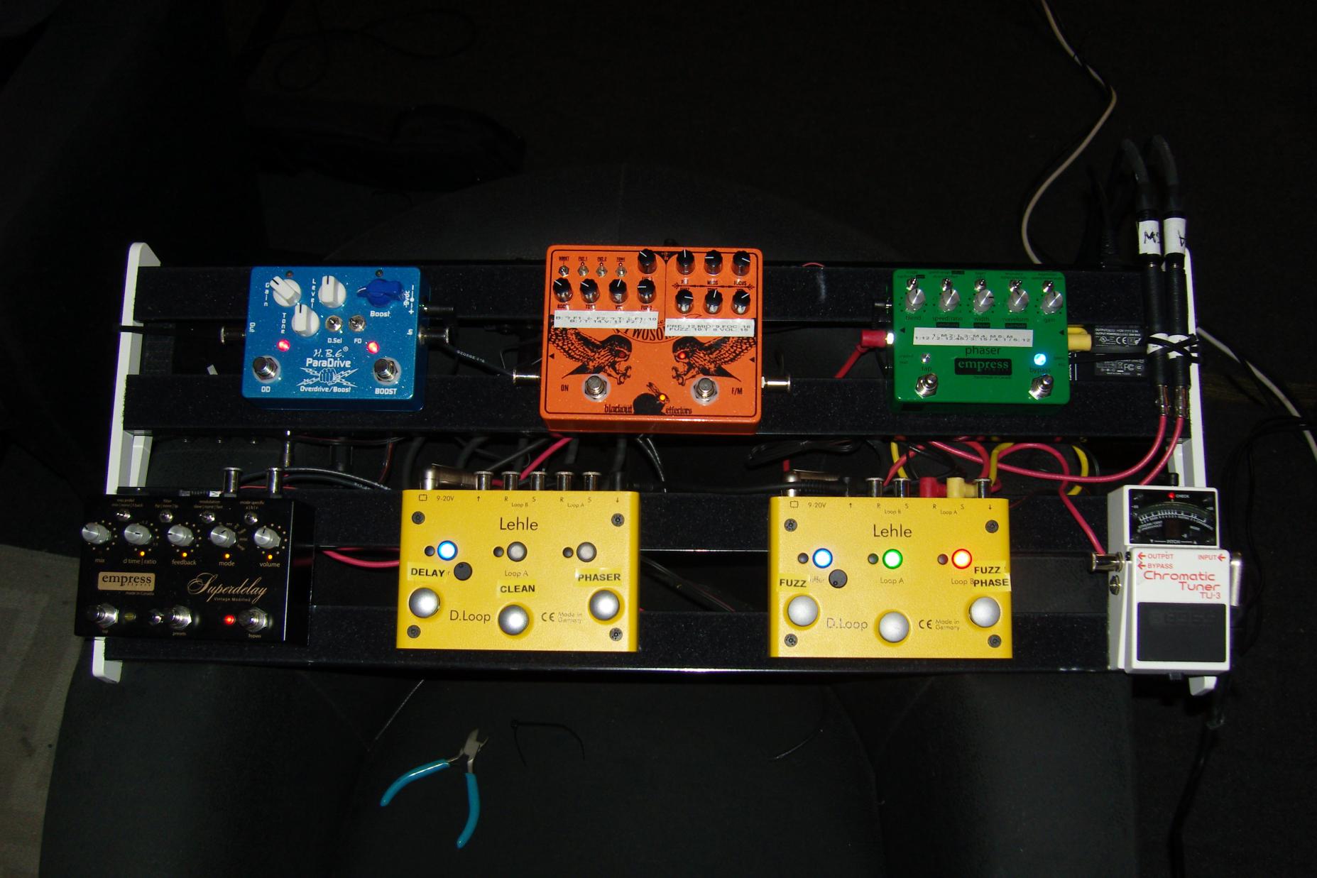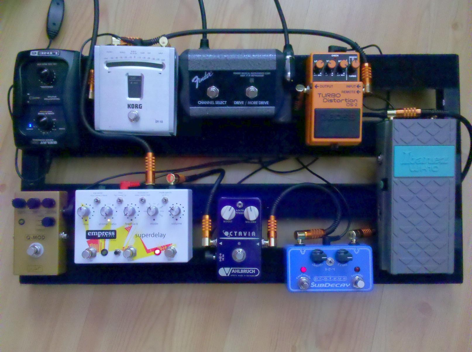 Korg Tuner --> Vox Clyde McCoy --> Doppellooper --> A: Ultimate Drive --> London ---> Boogie in a box (DIY) --> Box of Rock (DIY) ---> Doopellooper ---> TC Booster+