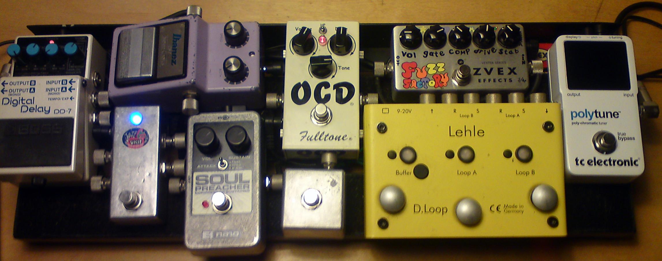 hier mal mein session-boardwas mich echt nervt: ich brauche eine separate stromversorgung für das line6 m5, da mein t-rex keine 500mA an einem ausgang liefert. selbst wenn ich 2 ausgänge koppel komme ich nur auf 240mA.