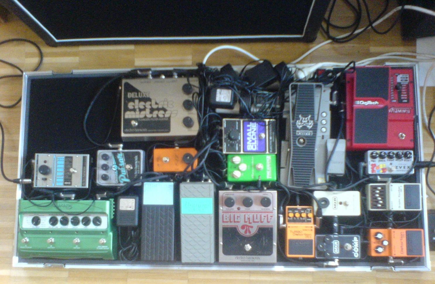 --> Zvex FuzzFactory -- Digitech Whammy -- Boss GE-6 -- Boss DS-1 -- Ibanez WD7 -- Boss DS-2 -- MXR MicroAmp -- MXR Super Comp -- EHX BigMuff -- Excalibur TS -- Ibaenz Wh-10 -- EHX SmallClone -- MXR Phase 90 1974 -- EHX Deluxe Electric Mistress -- EHX Pulsar XO -- Boss FV50 Volume -- DL4 -- EHX HolyGrail -->