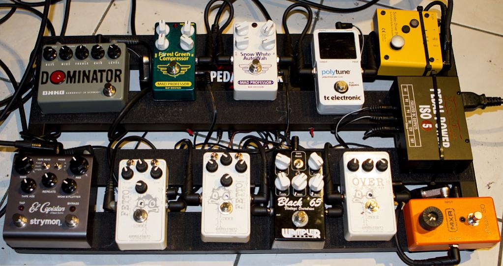 Sunday Driver > Polytune > Snow White Auto Wah > Forest Green Compressor > Phase 90 > Under Over > Black 65 > Fetto Custom > Fetto C-Luxe > Dominator > El Capistan