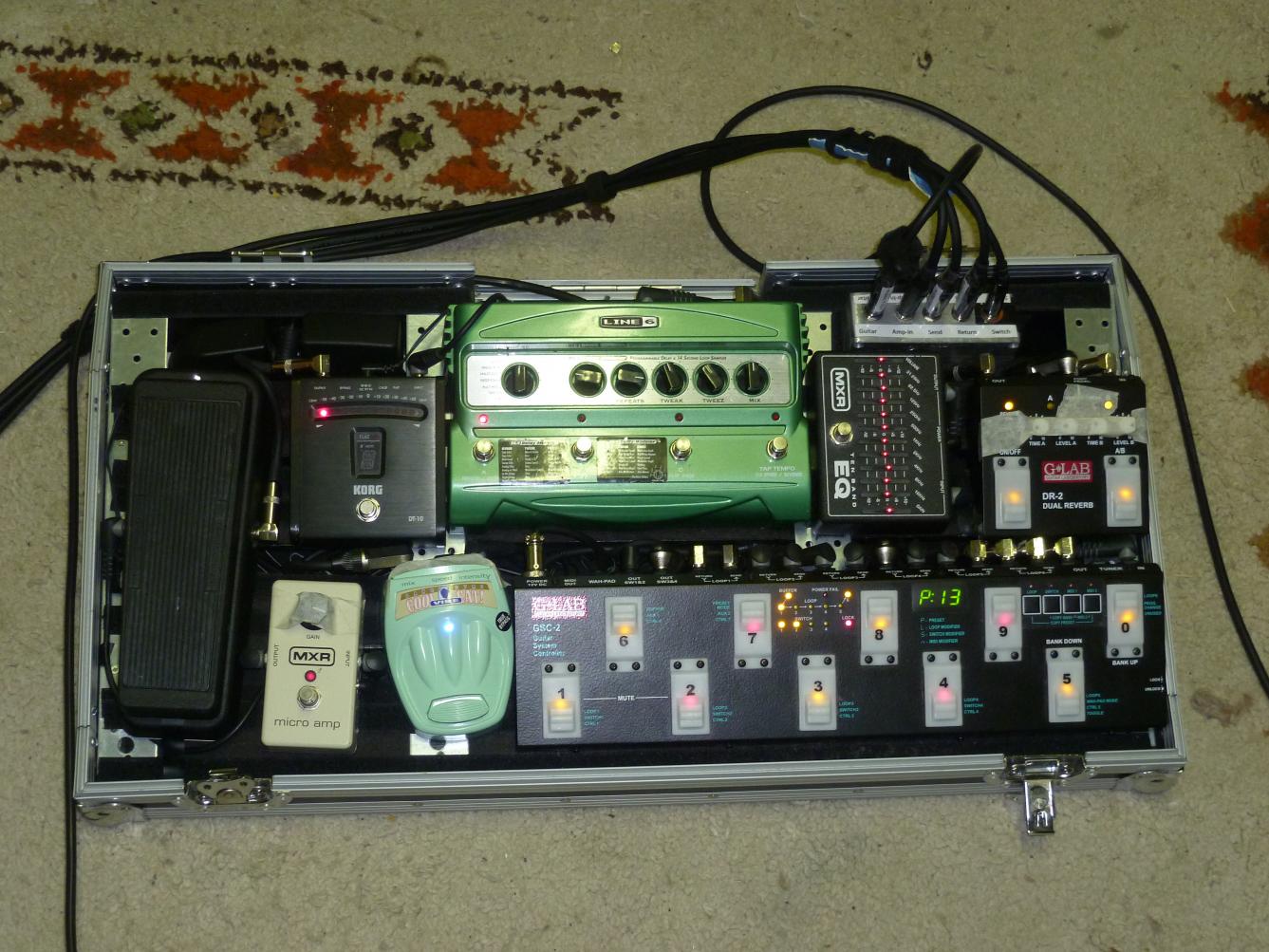 Tuner -> Wah -> Amp-Vorstufe -> EQ -> MicroAmp (hier in der Position leicht zweckentfremdet) -> Cool Cat Vibe -> DL4 -> G-Lab DR-2 Reverb