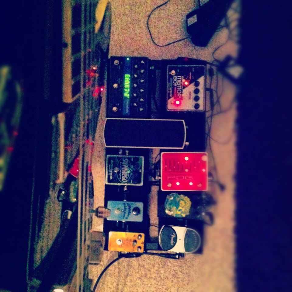 Unterm Board befindet sich noch ein VoodooLab PP2+ mit dem alles (auch das Nova) gefüttert wird und ein GLab 4x Midi Looper in dem mein Proton, Scarab, Musket und Lex hängt. Damit kann ich meine zusätzlichen Bodentreter via Midi schalten.
