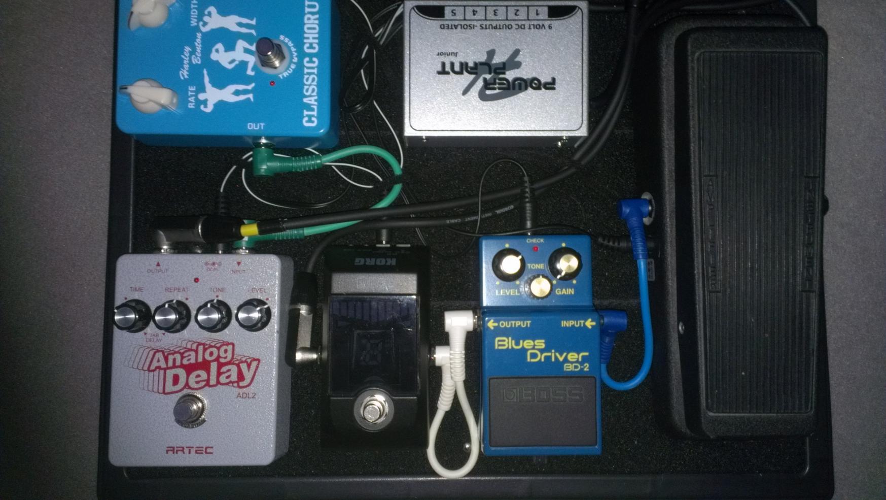 Das Cry Baby und der BluesDriver sitzen vor dem Amp, das Delay und der Chorus im Effekt-Loop.