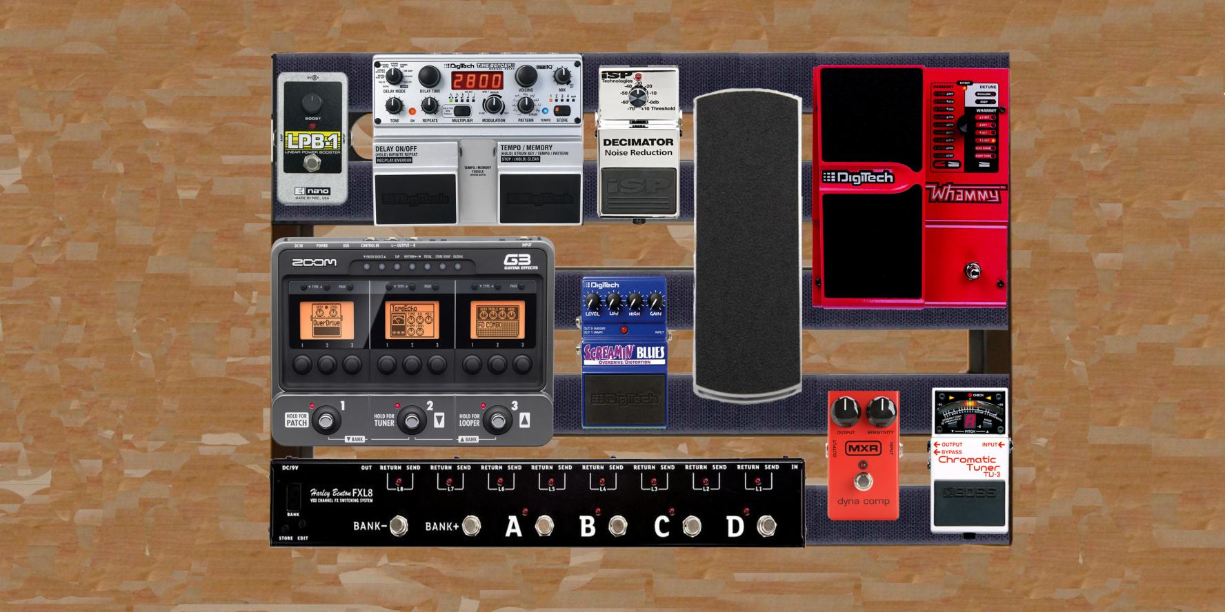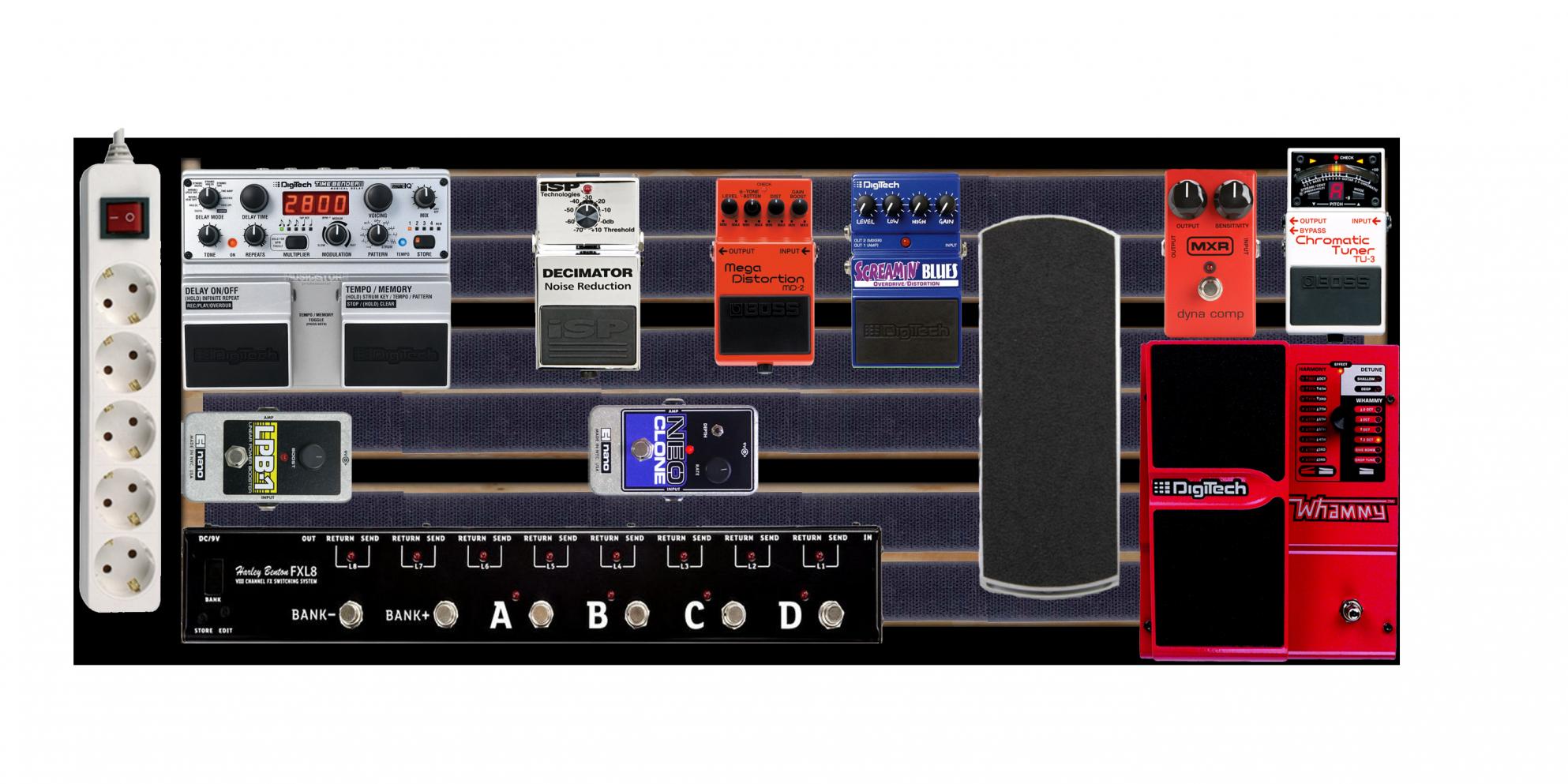 Zum Beispiel habe ich das Zoom G3 auch noch nicht. Mein Pedalboard sieht in "echt" grade so aus: