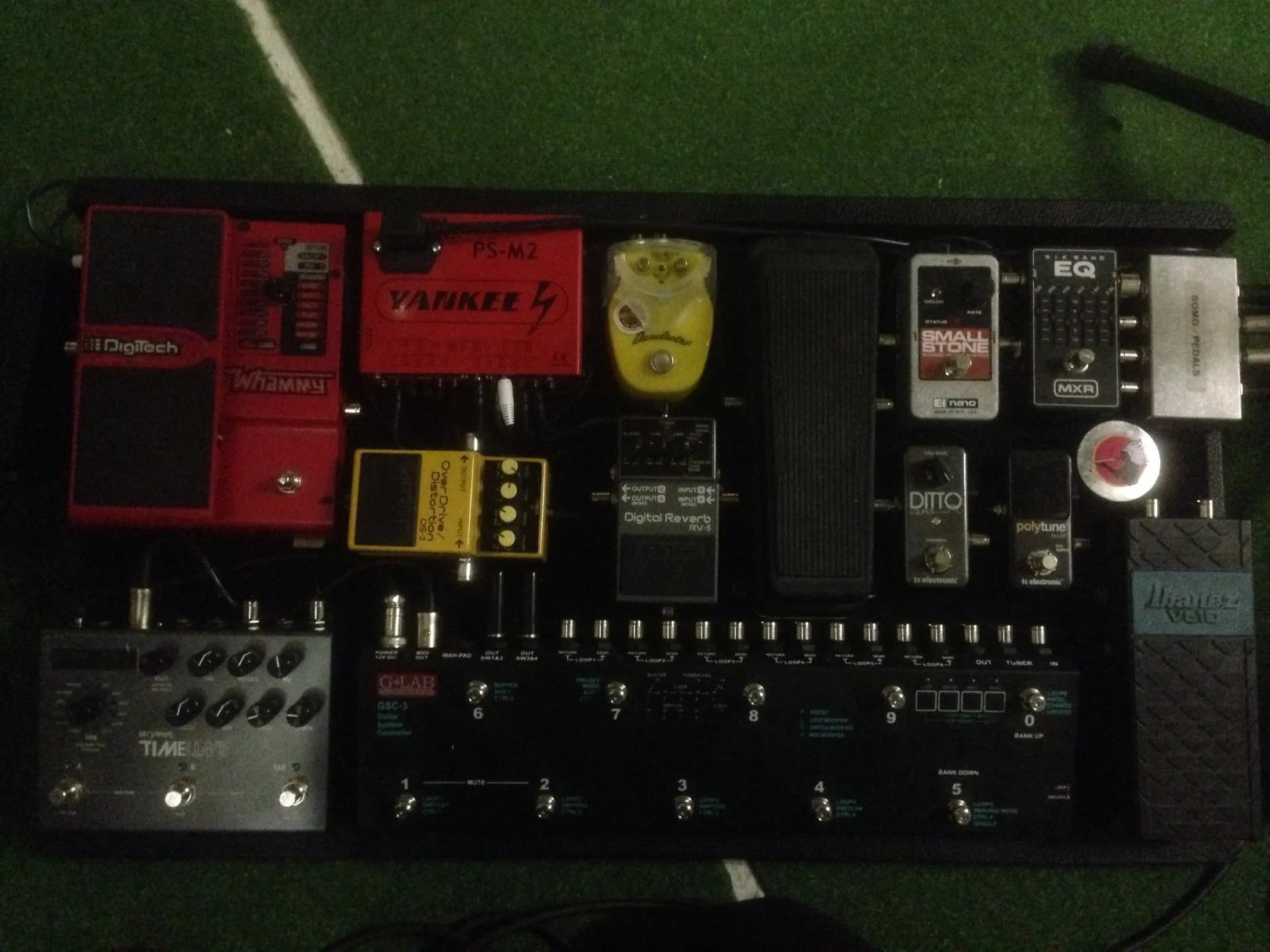 Ich benutze den Midiswitcher, um den 4x Looper unter dem Board zu steuern, in dem die drei oberen Pedalen in einzelnen Loops sind.