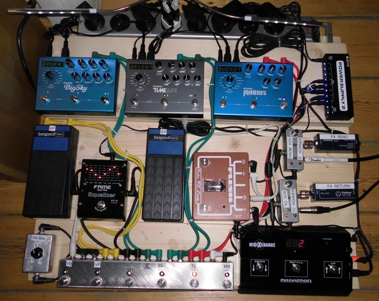 Effektreihenfolge - Strymon Mobius, Strymon Timeline Strymon Bigsky, Fame EQ, Bespeco Volumen Pedal, Somo Pedals Volume Box