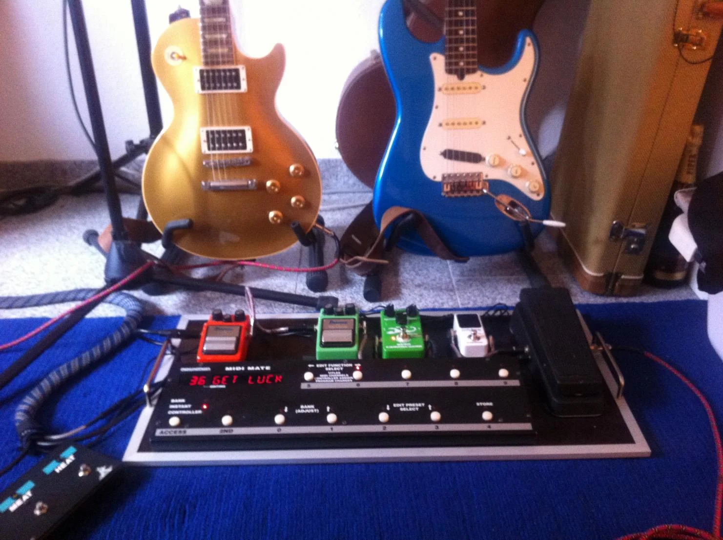 Neben dem Board liegt der Fußschalter für den Steavens Amp. Das Wah wird mit dem linken Fuß bedient. Ich stelle mich dann rechts neben das Board (macht Steve Lukather auch so, nur eben als Rechtsfüßler).