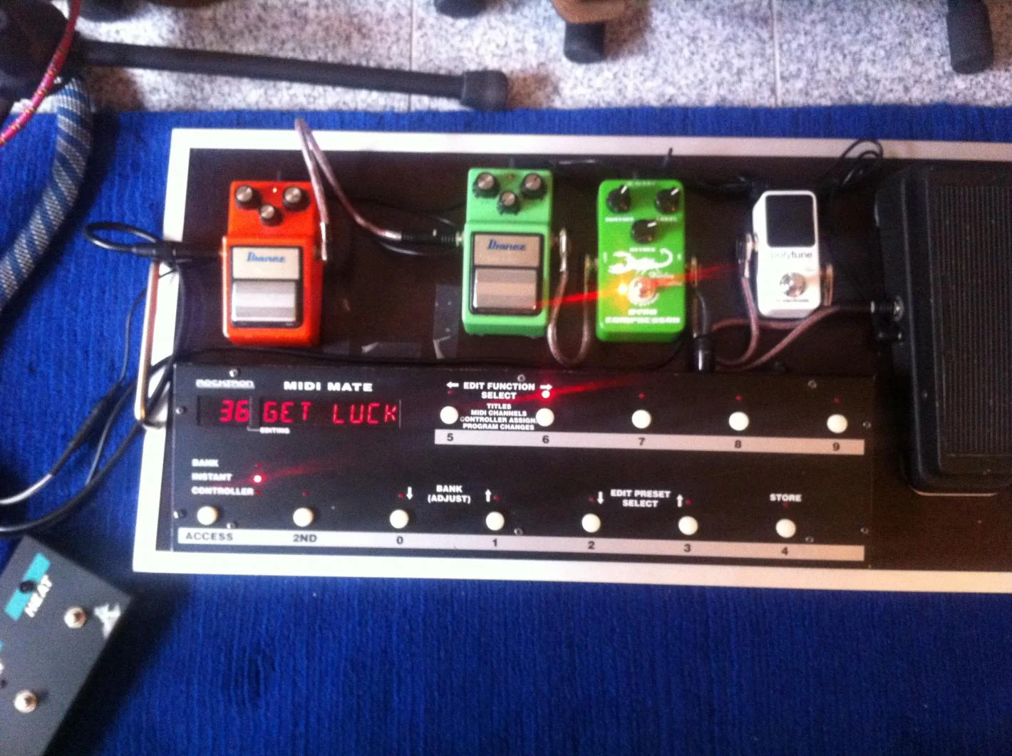 Ibanez Pedale sind mit Relay True Bypass Platinen dazu modifiziert worden. Es ist kein Buffer im Signalweg. Kabel auf dem Board sind Sommer Patchkabel mit dem grässlichen Namen Grindy Cop beast. Das Kabel zum PT9 bekommt noch einen flachen Hicon Stecker angelötet und wird gekürzt.