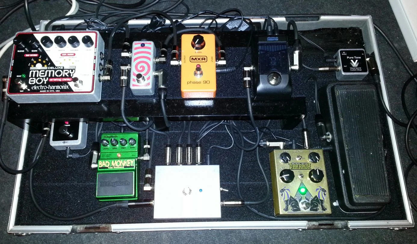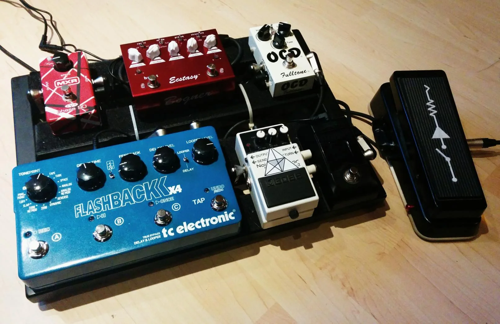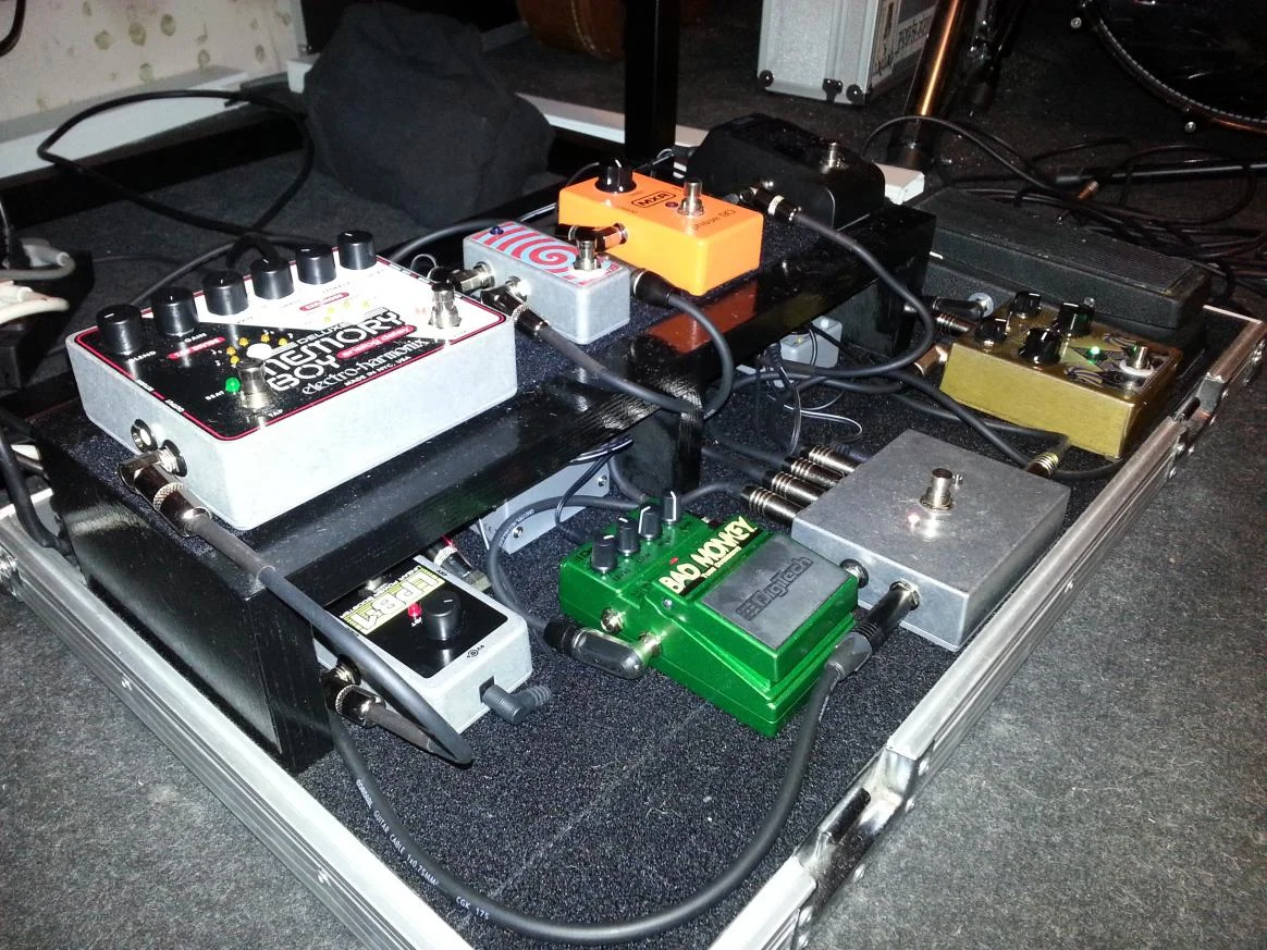 Um den Electric Mistress ist noch Platz, wie man sieht. Hier habe ich u.U. vor, noch einen Selbstbau-Bypass vom Musikding zu setzen, mit dem ich die komplette zeitverzögernde und modulierende Kette aus dem Signalweg nehmen kann. Unbedingt erforderlich ist er allerdings nicht. Es gibt - und das hat mich positiv überrascht - mit meinen Strats dran keine Signalausdünnung oder -verfremdung, wenn alle Effekte ausgeschaltet sind.