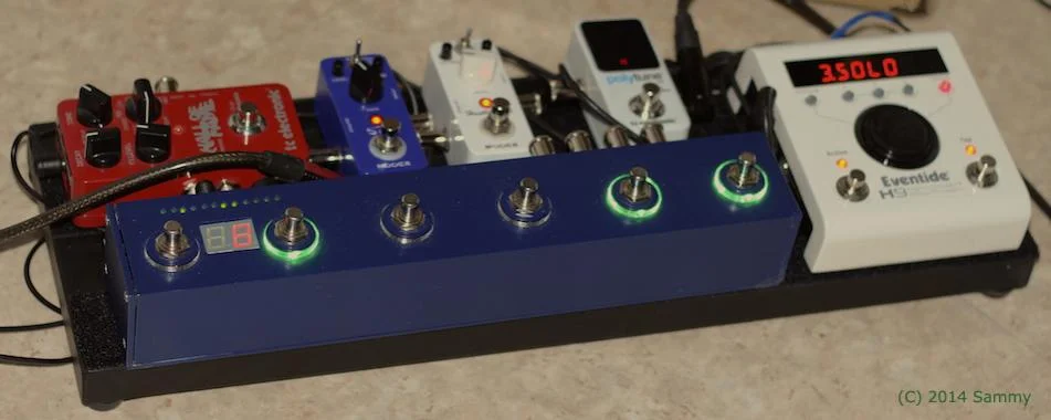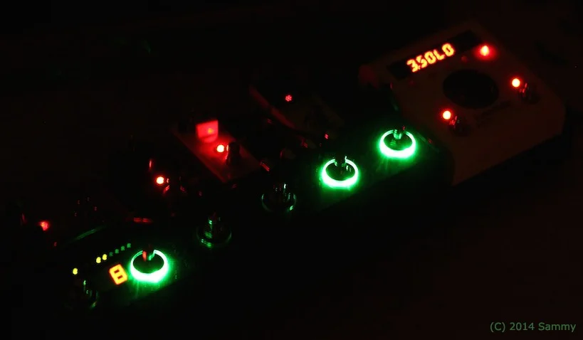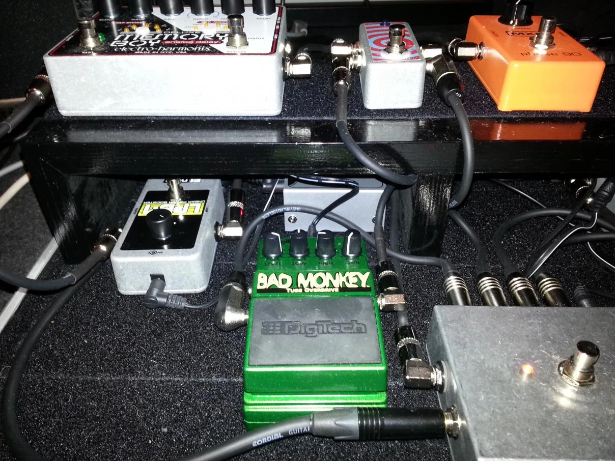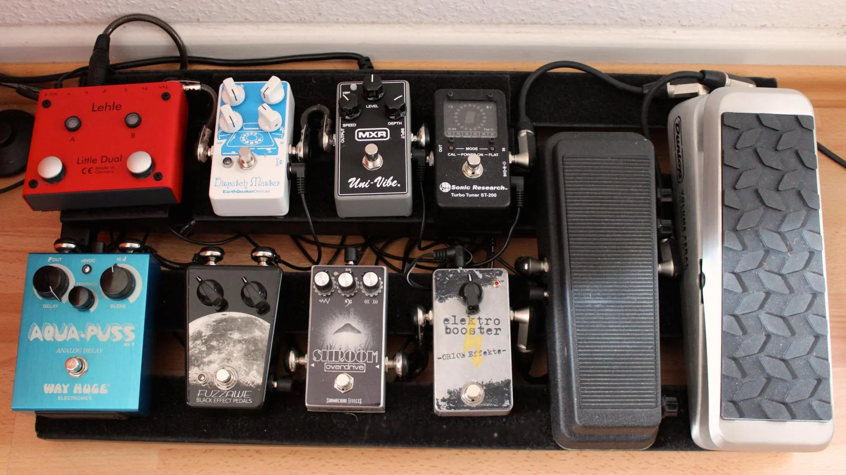 Um den Electric Mistress ist noch Platz, wie man sieht. Hier habe ich u.U. vor, noch einen Selbstbau-Bypass vom Musikding zu setzen, mit dem ich die komplette zeitverzögernde und modulierende Kette aus dem Signalweg nehmen kann. Unbedingt erforderlich ist er allerdings nicht. Es gibt - und das hat mich positiv überrascht - mit meinen Strats dran keine Signalausdünnung oder -verfremdung, wenn alle Effekte ausgeschaltet sind.