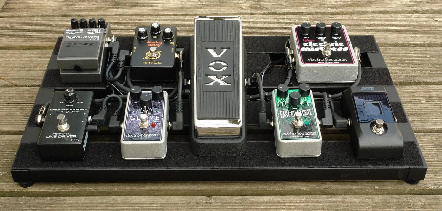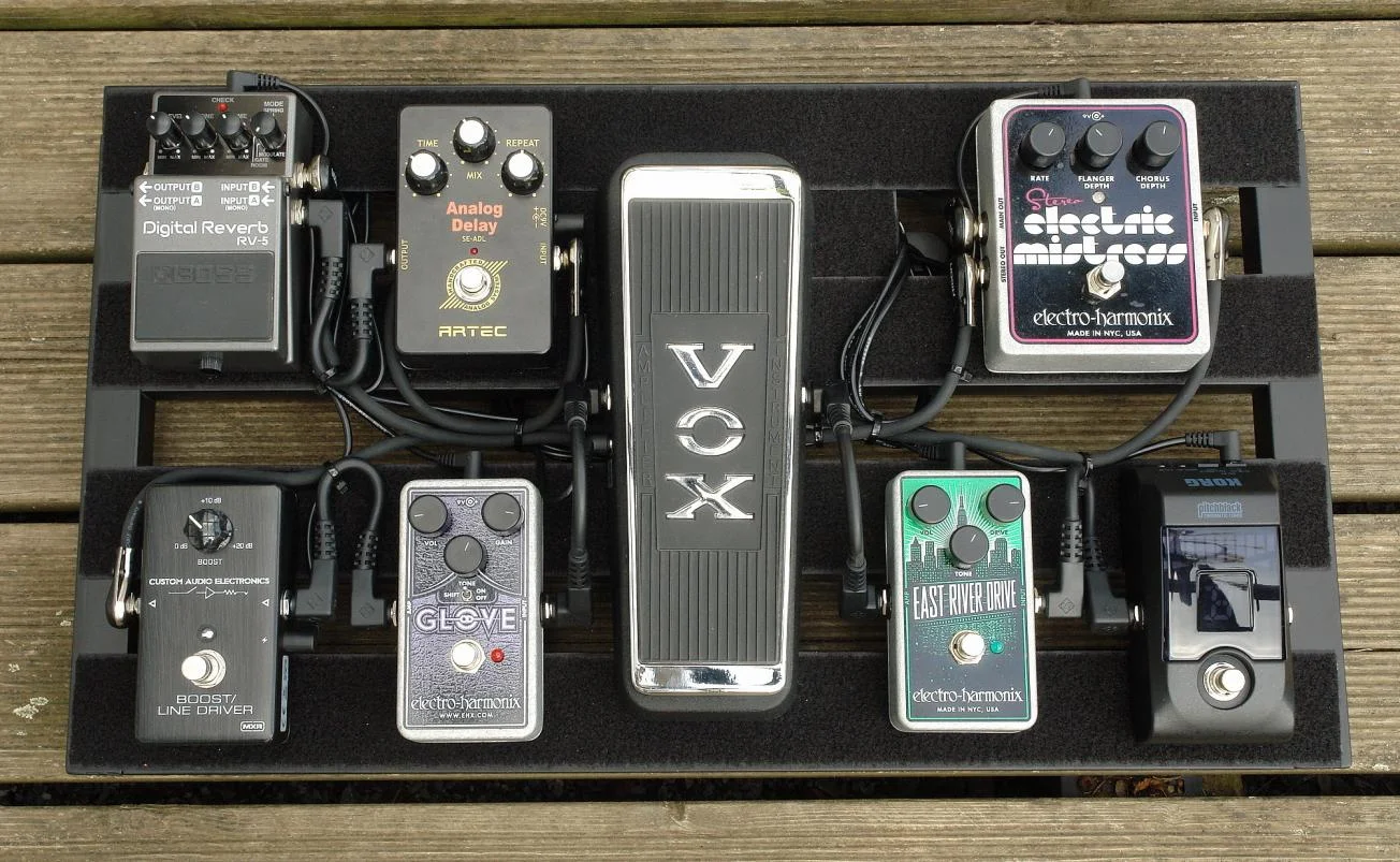 Das Signal dürchläuft den Tuner, dann geht es in die erste Zerre - EH East River Drive. Ein TS-Klon mit überzeugendem Sound. Anschliessend geht es ins Wah.