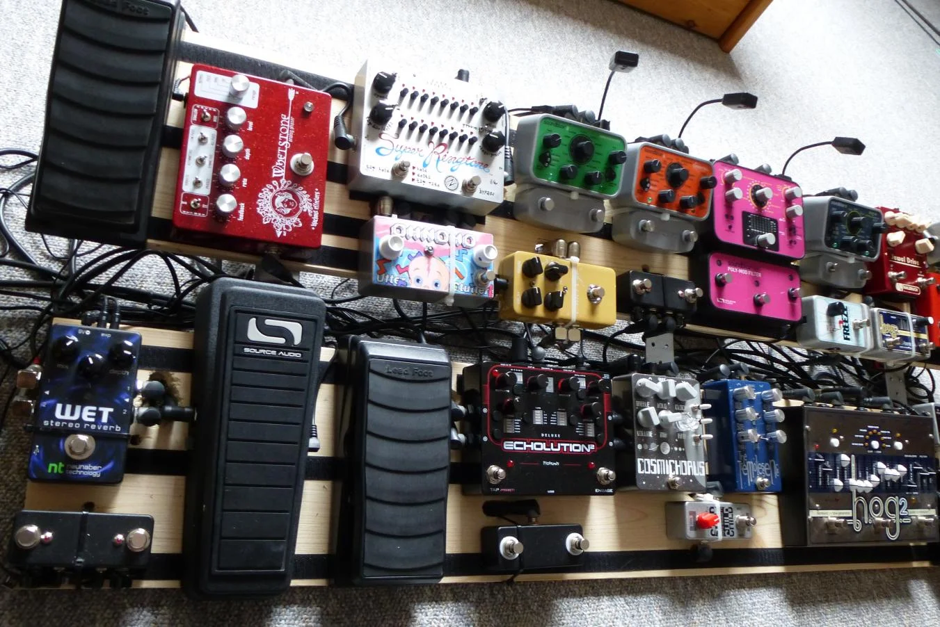 nach 1,5 Jahren Bauzeit mit vielen Versuchen und Optimierungen bin ich nun (vorerst?) mit meinem Effektboard fertig. Vor allem die Trennung von Strymon Timeline und Mobius, um stattdessen (Modulations-)Einzelpedale zu nutzen, war aufwendiger als zunächst gedacht. Die Ansprüche an die Nachfolger sind entsprechend hoch.