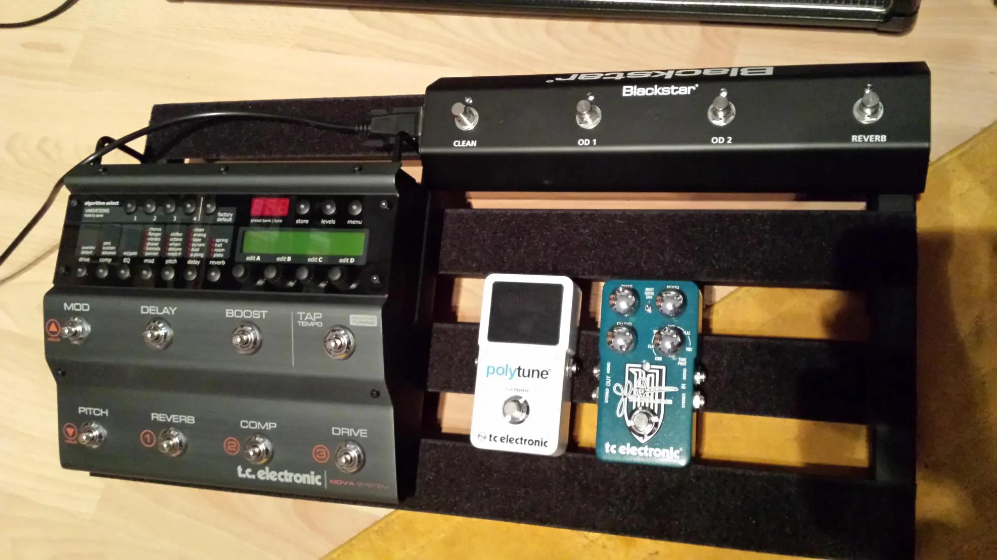 Es ist noch nichts verkabelt, denn ich bin mir wegen der Reihenfolge noch nicht ganz sicher. Was kommt als erstes nach der Gitarre? Das Nova oder Polytune, etc.? Das rechts oben gehört übrigens zum Amp dazu....