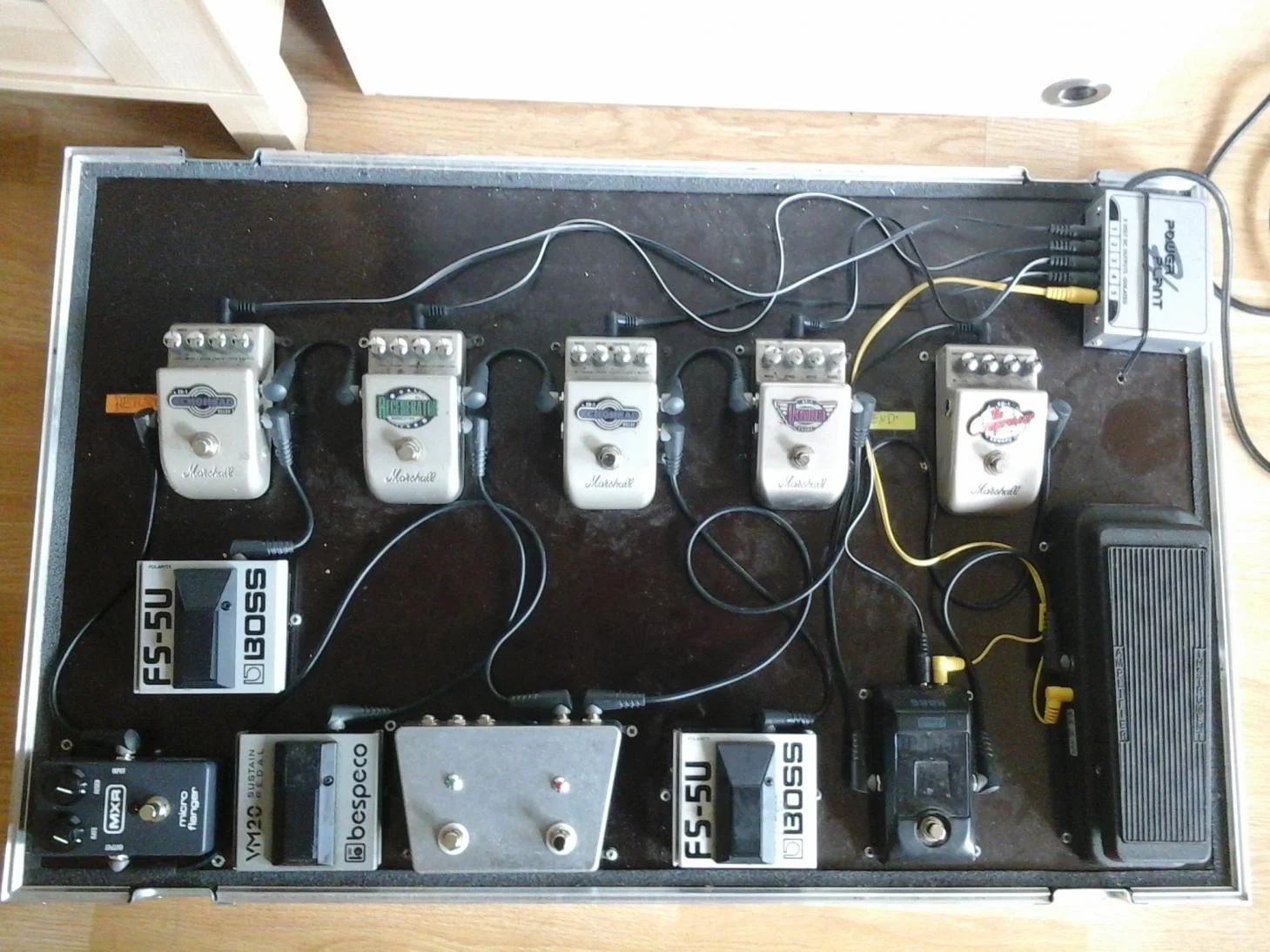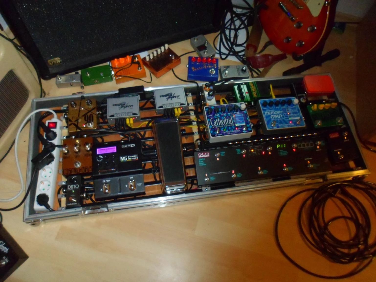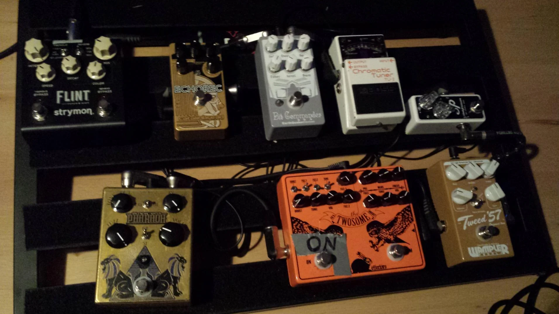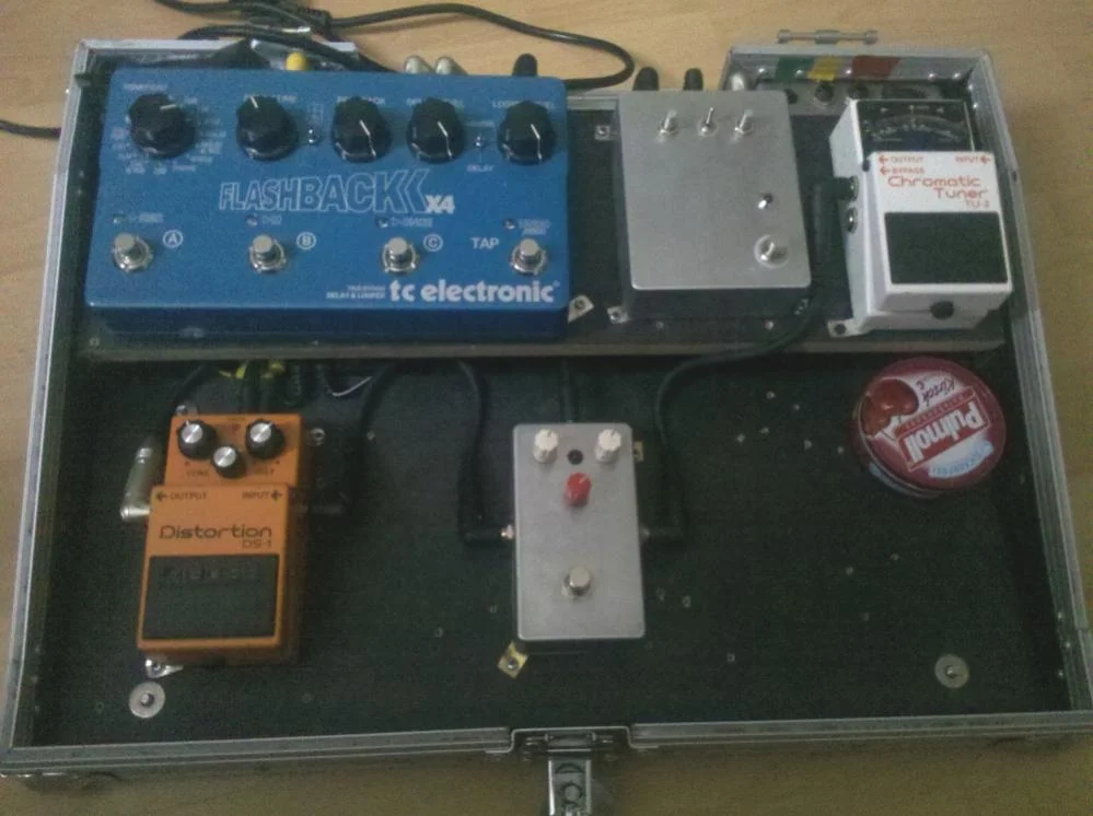Effektkette: Gitarre -> TU-2 -> Overdrive -> DS-1 (Mod) -> Patchbox am hinteren Rand, Roter Stecker für Effektloop -> Tri-Vibe -> Flashback X4 -> Stereo out zur Patchbox, von da an 1 oder 2 Verstärker zurück.