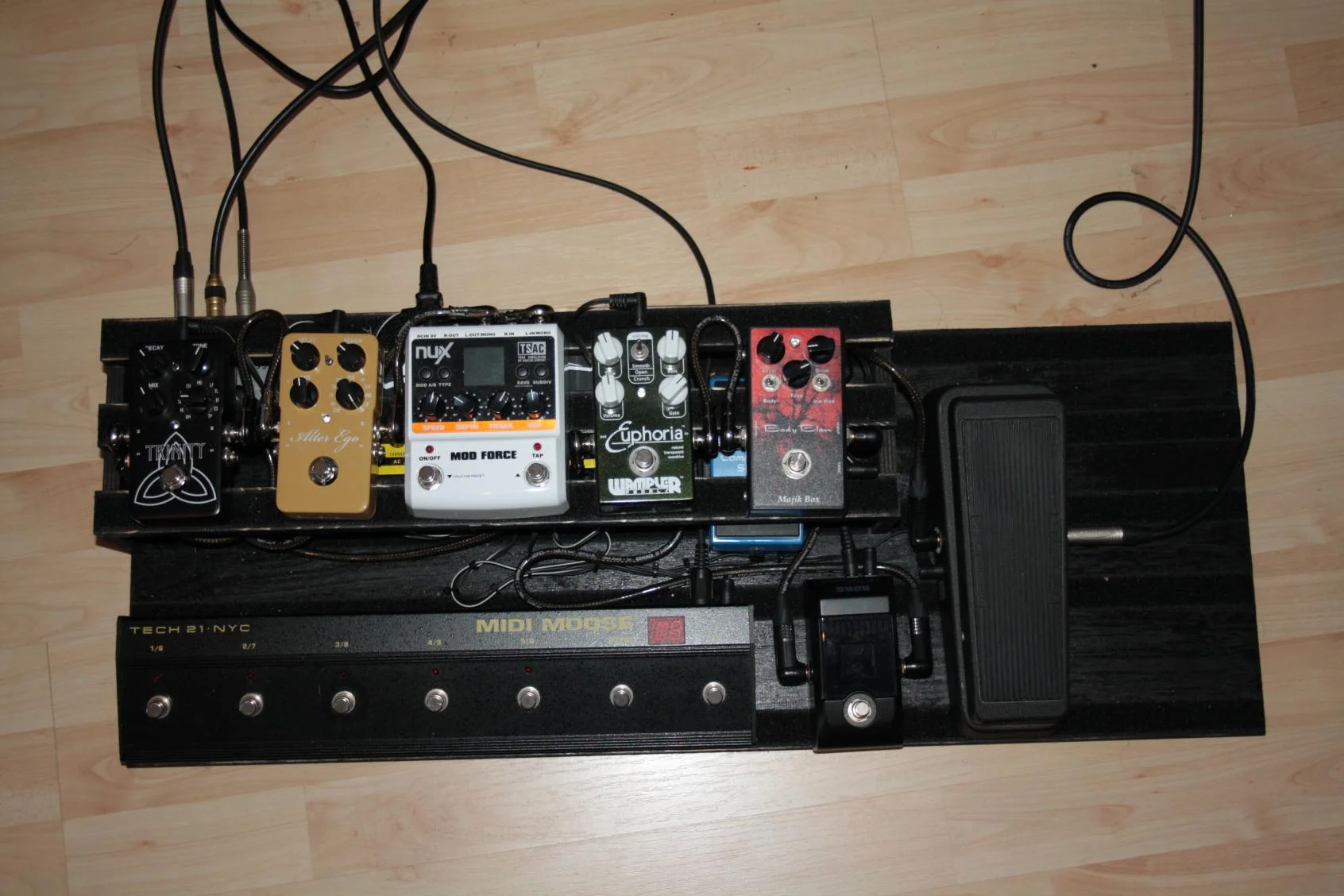 So, mein Pedalboard hat sich auch wieder ganz schön verändert. Leider mit einer Kartoffel fotografiert, bitte entschuldigen.