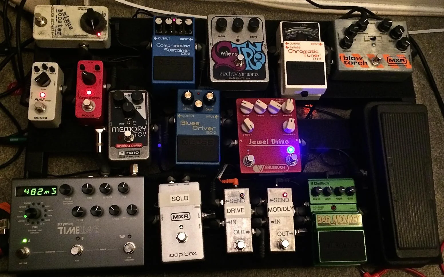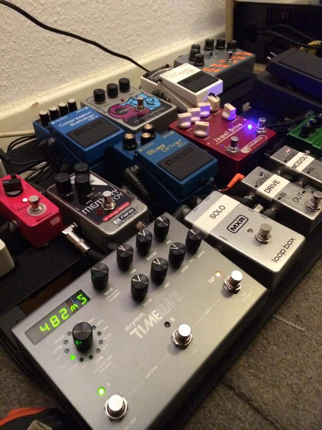 Mir war wichtig, dass ich schnell und unkompliziert von Vollgas auf Clean oder von Solo auf Clean mit Effekt umschalten kann, deswegen die 3 True Bypass Looper. Das Optimum wär jetzt noch ein True Bypass Looper, dessen Return immer anliegt... damit die Delays ausklingen können wenn man den Loop ausmacht. Weiß jemand, obs sowas gibt? Am besten möglichst klein...?