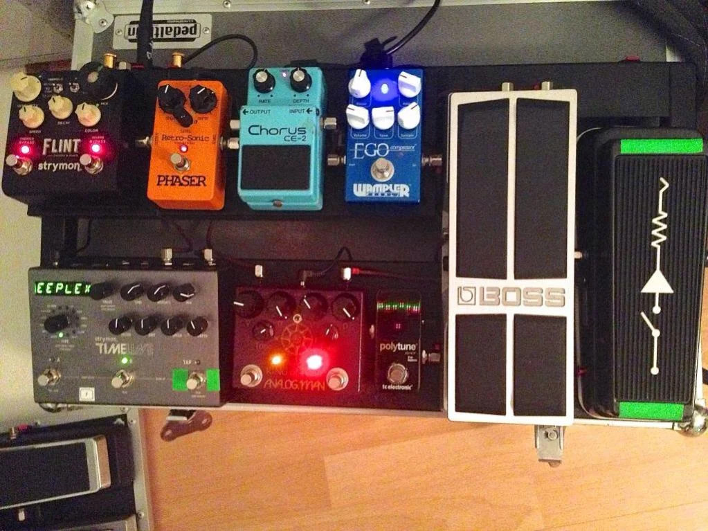 Wie bei allen anderen Dingen bin ich auch beim Effektboard (bei mir im wahrsten Sinne des Wortes ein stinknormales Holzbrett) sehr minimalistisch.