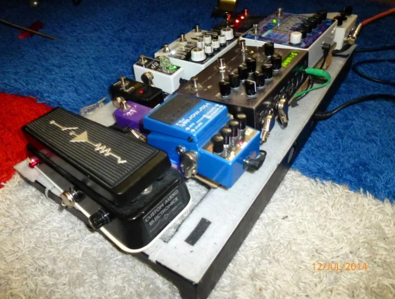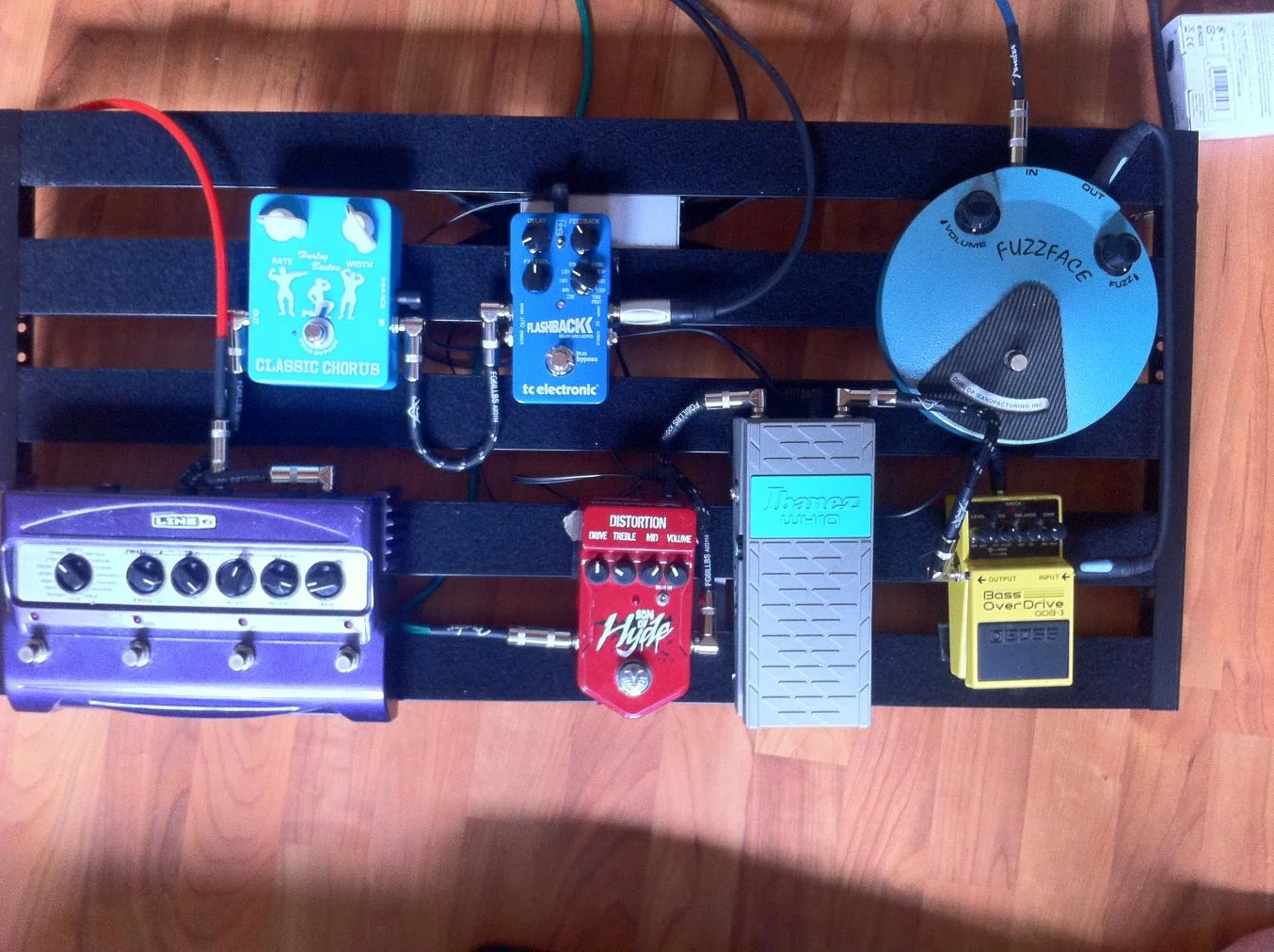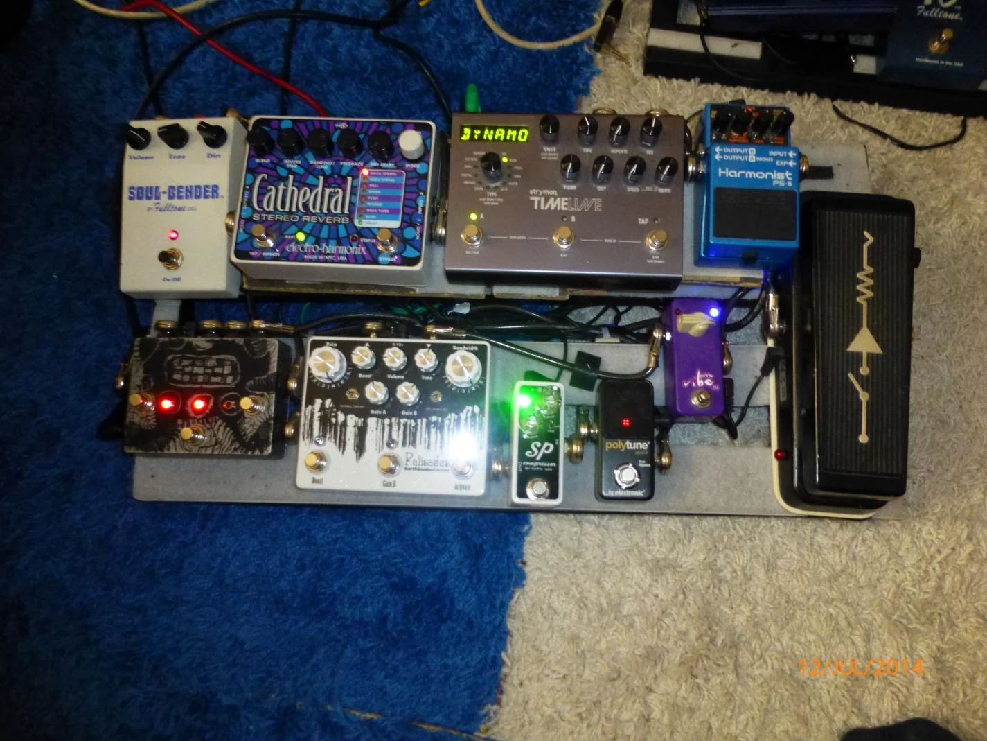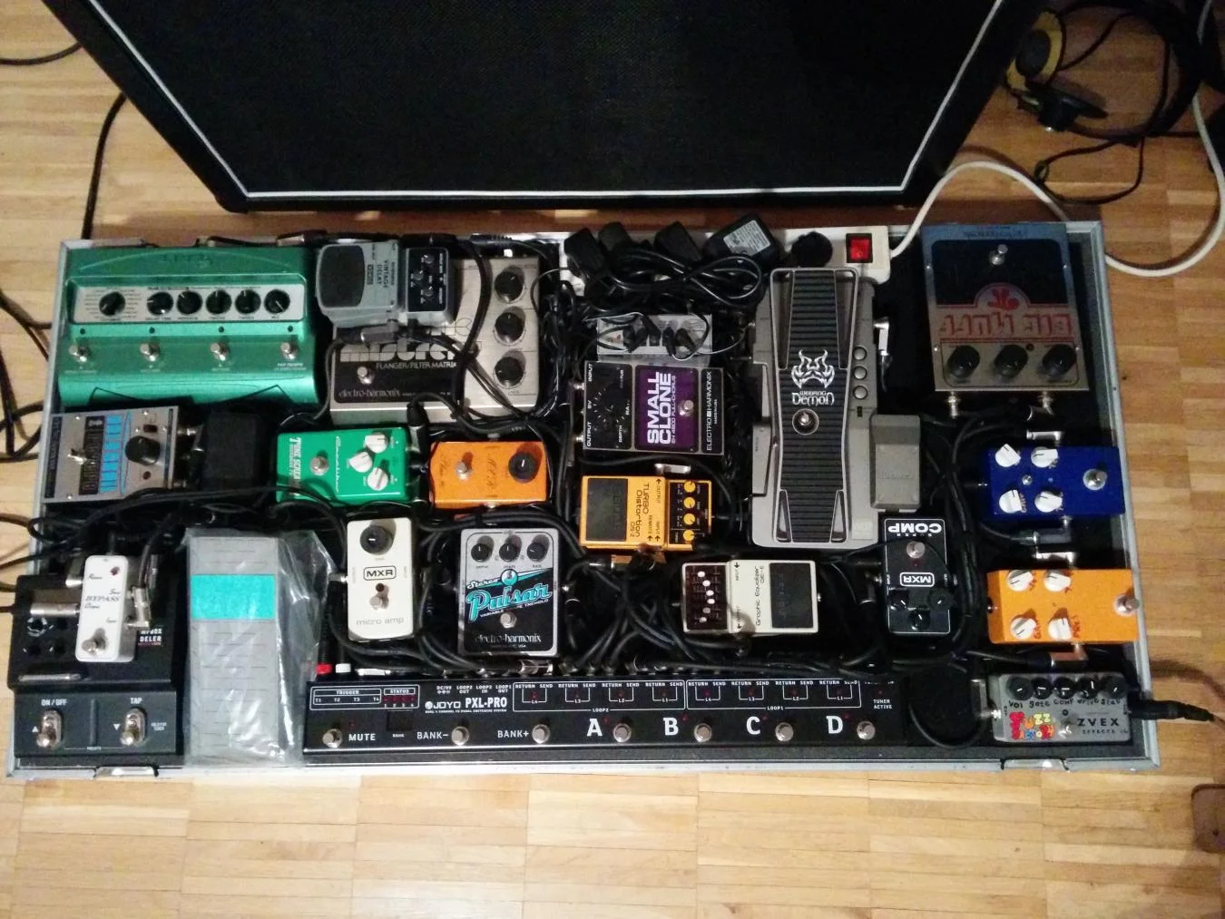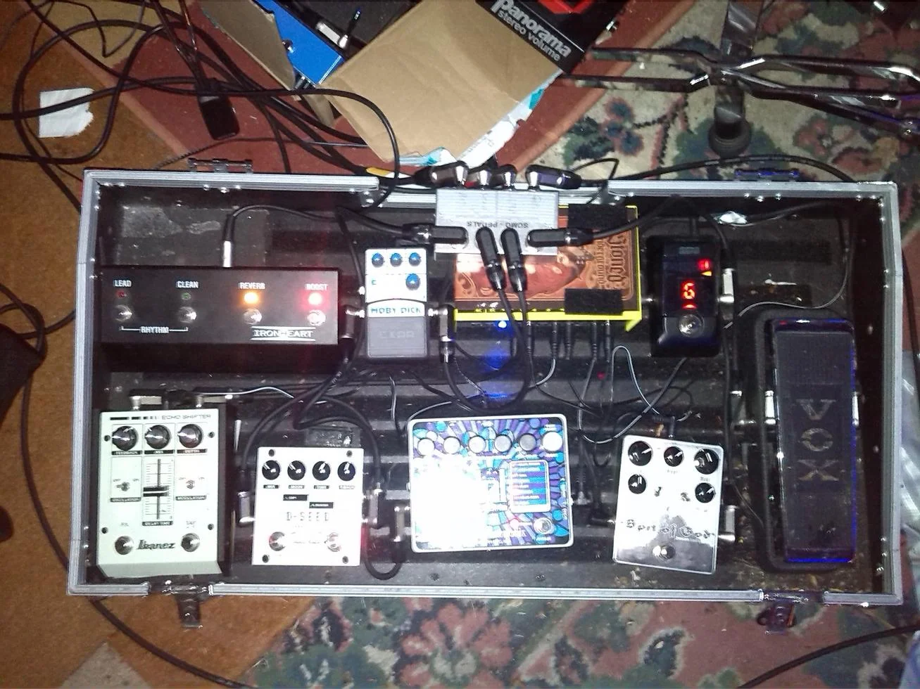 Die Kette ist Ultra Swede -> Tuner -> VoxWah -> Fuzz -> Cathedral -> ES-2 Delay -> FXLoop -> Moby Dick Chorus -> D-Seed Delay -> Laney Ironheart.