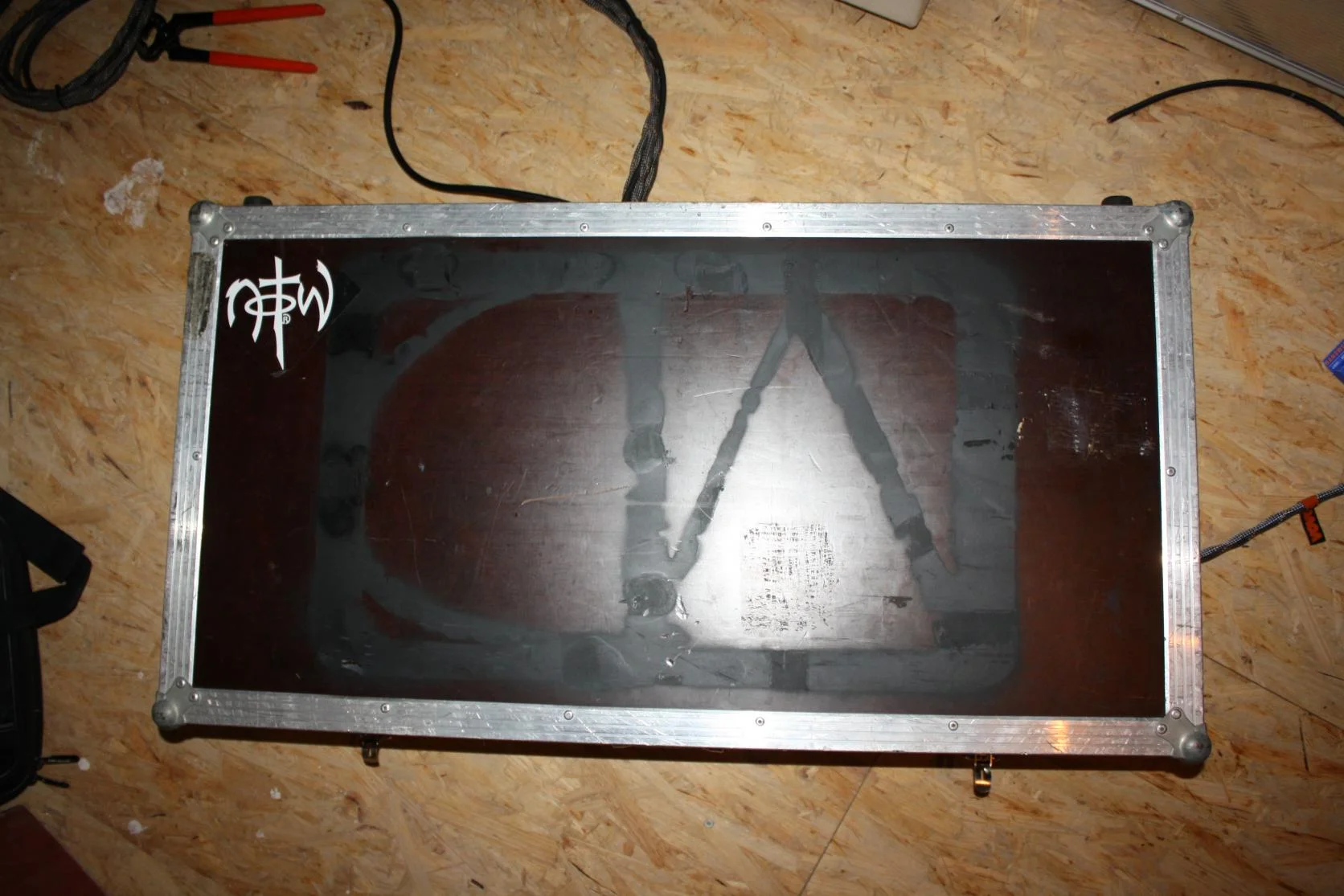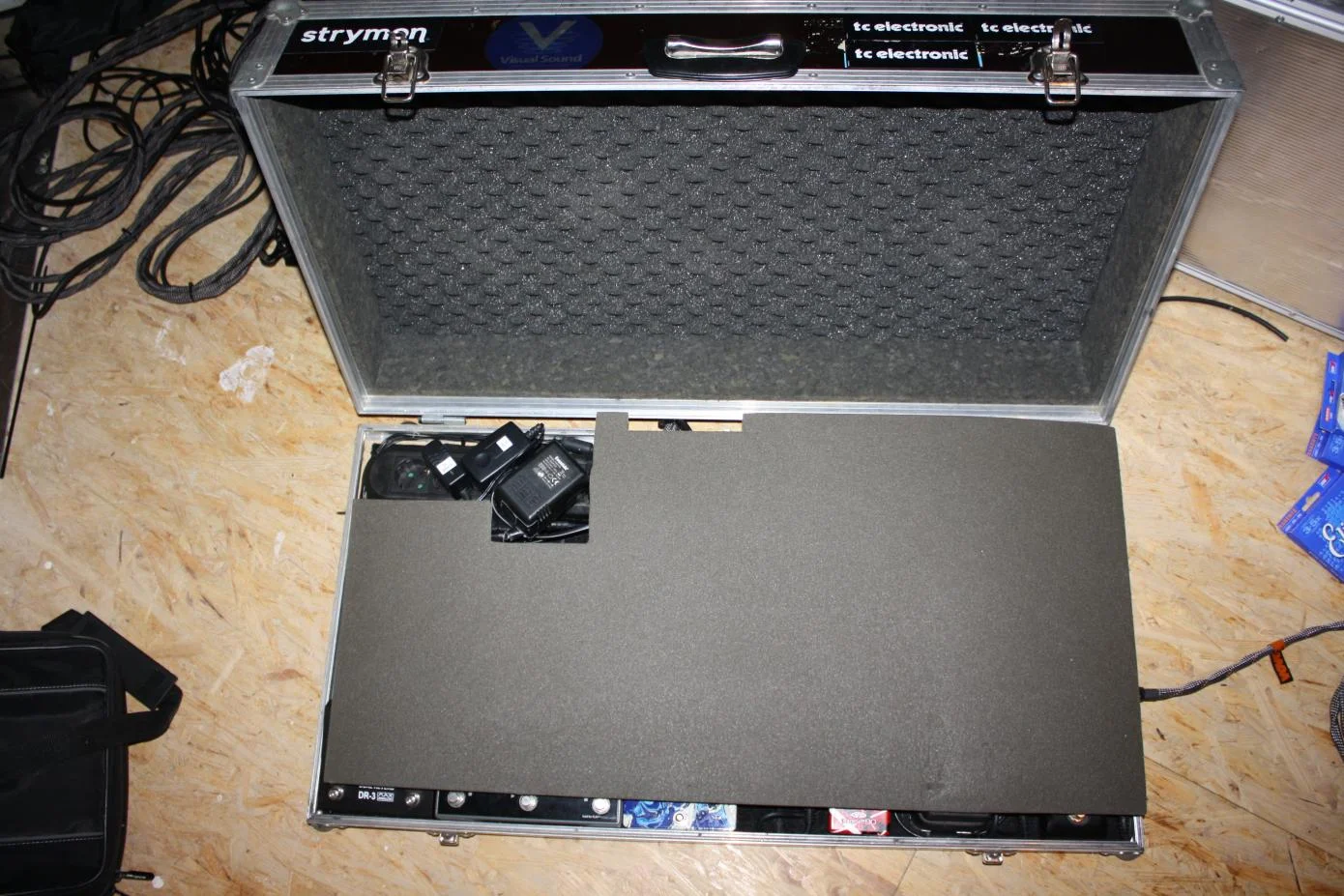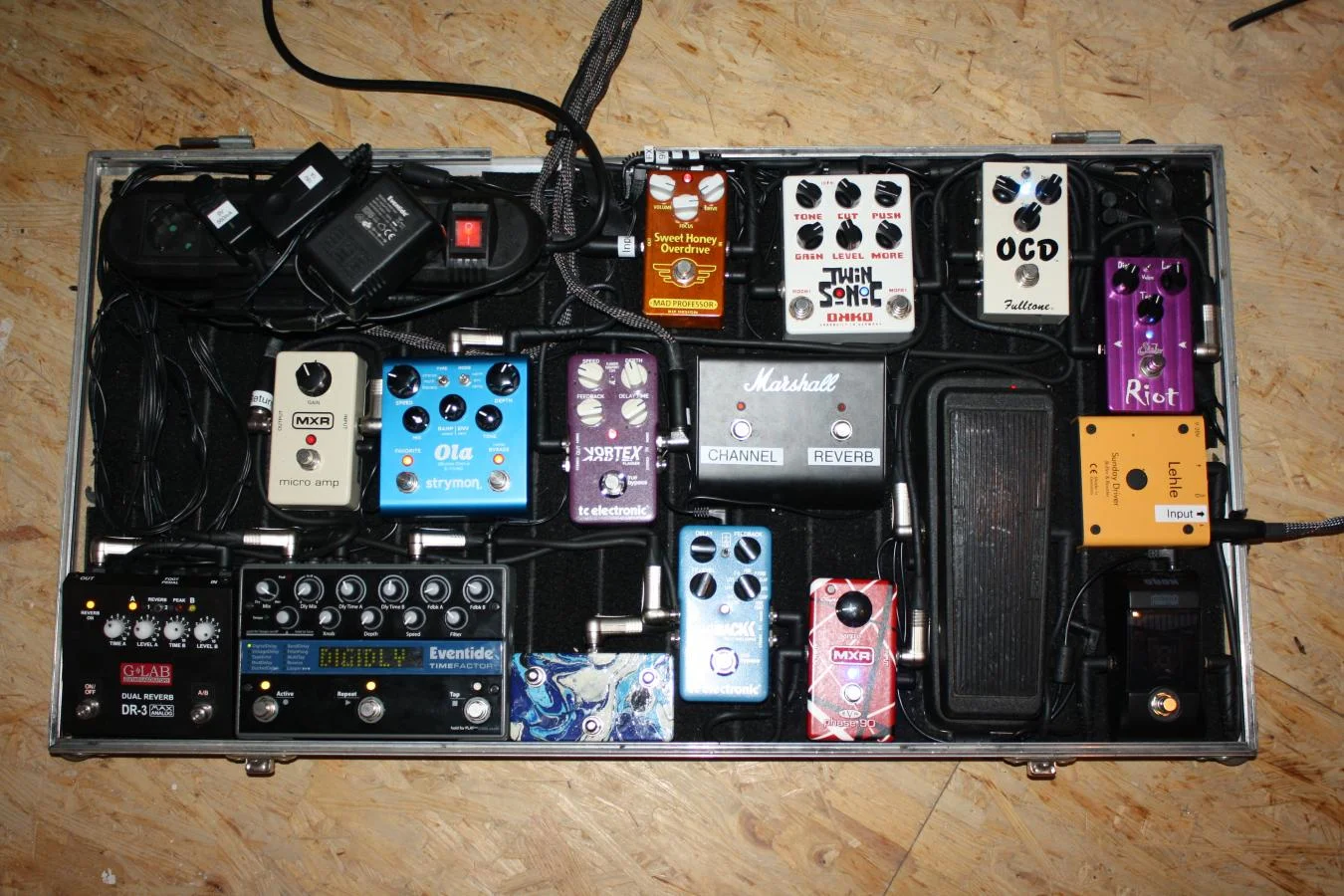 Das Case ist ein Showmaster 24-Case, in das ein mit Teppich bespanntes Brett eingesetzt wurde. Netzteil ist die Powerplant Junior von HB. Das Gitarrenkabel geht in den Korgtuner (linke Boardhälfte, da ich Lefty bin), von da in CryBaby (mit TB und LED), dann in das Boss NS-2. In dessen Loop hängen der HB Compressor, der Vintage Overdrive und eben jetzt der Behringer-Shifter (dessen Expression-Pedal passt noch in den Deckel vom Case).