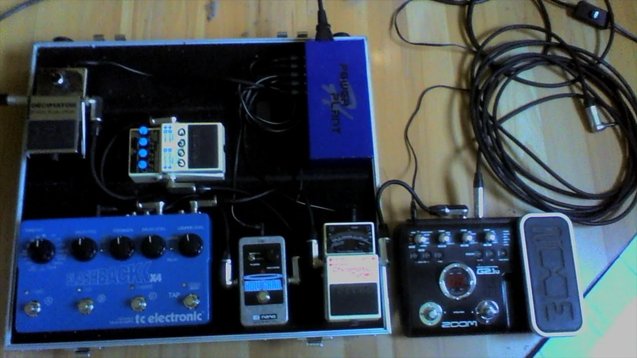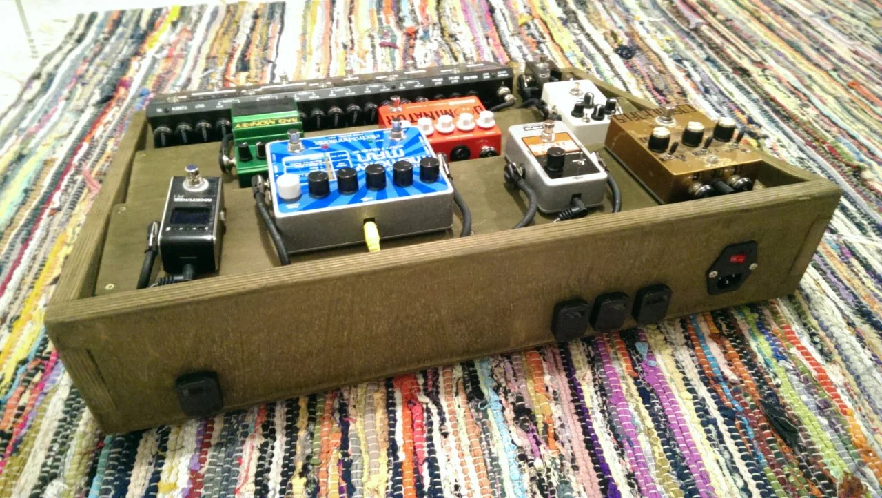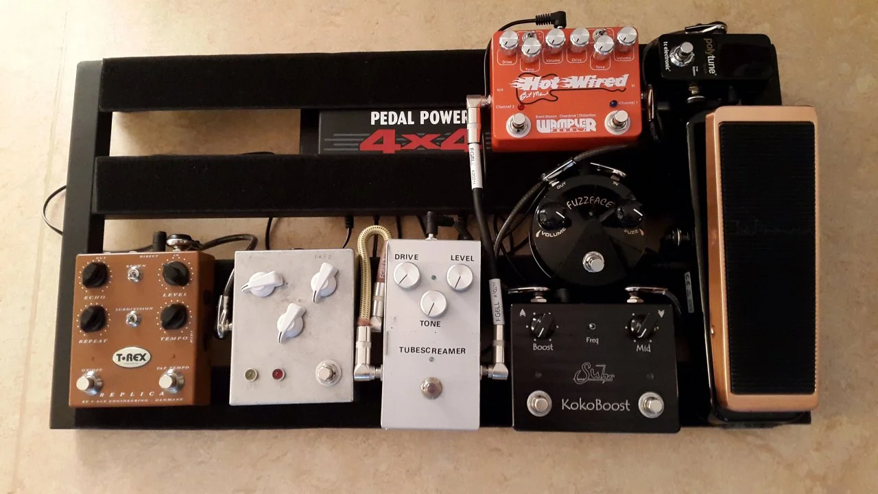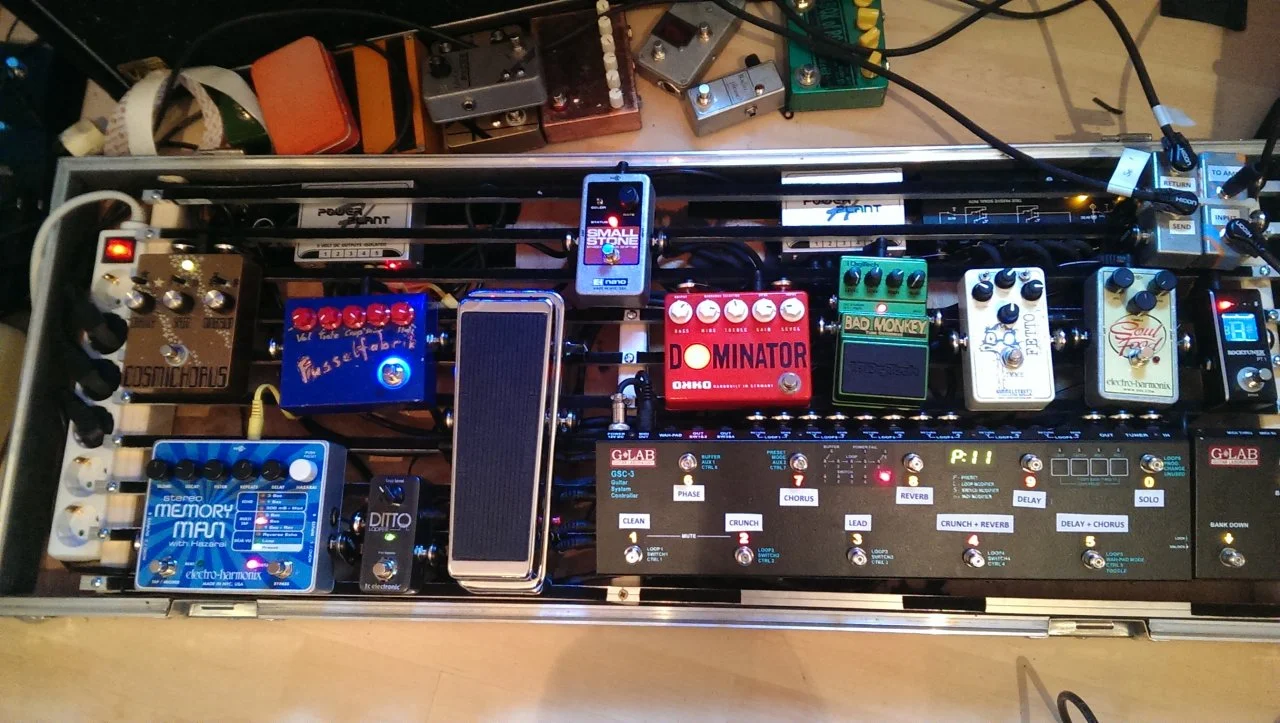 Zeitens brauche ich für den Ehx Cathedral und den Reußenzehn Tubebooster ( der soll mit dem Wah rechts daneben , auf Bodenniveau ) ein extra Netzteil ( Wandwarze ) .