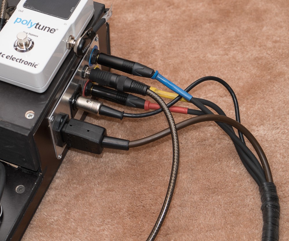 da habe ich mir auch mal was gebastelt, das ständige zusammenstöpseln ist mir doch auf den Nerv gegangen. Alle Kabel die zum Board hin oder zurück gehen habe ich in einen Gewebeschlauch gezogen. Die Buchsen für In/Out, Loop Send/Returne, Ampumschalter und Strom habe ich auf die rechte Seite eingebaut.