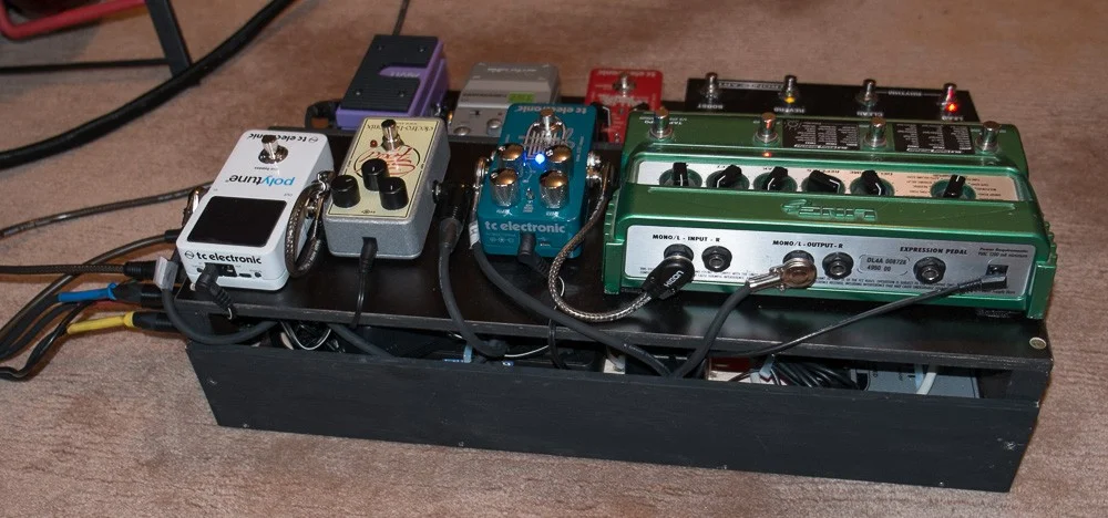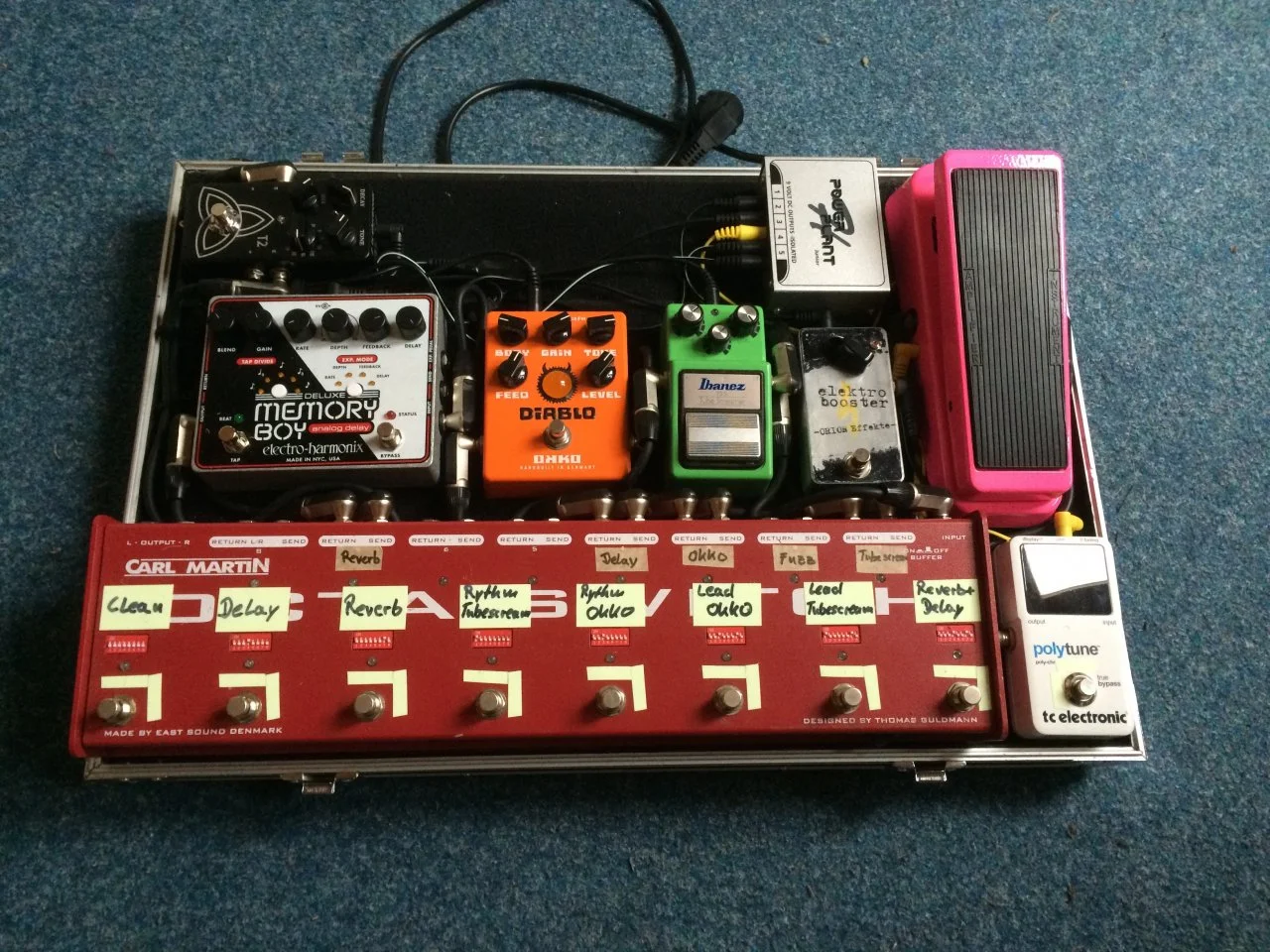 Die Reihenfolge: Git > Polytune > SoulFood > AMT "japanese girl"(was für ein Name für ein WahWah) >Ibanez TS7 > TC Hall of Fame. TC Dreamscape und Line6 Echo sind im Loop vom Amp.