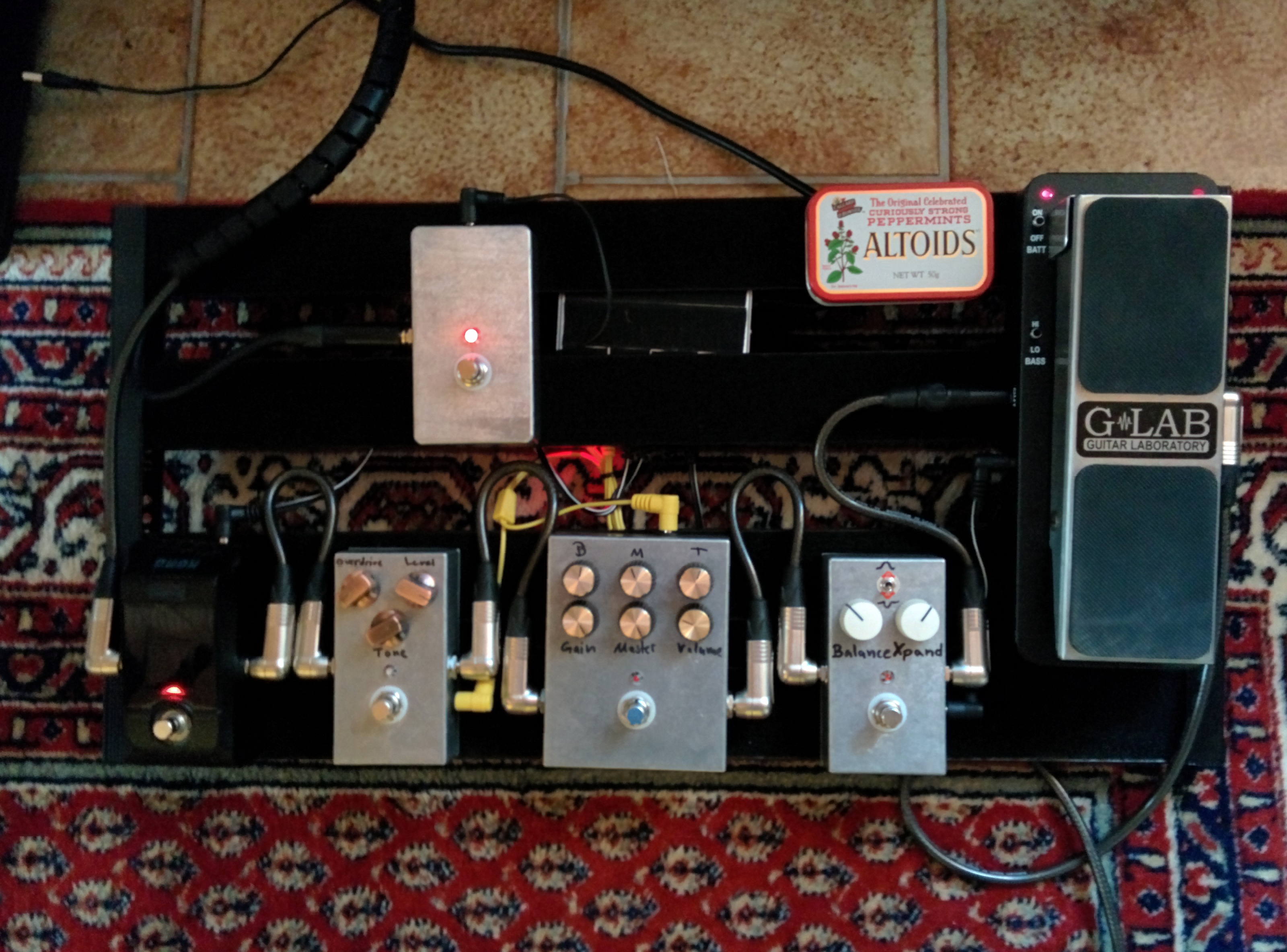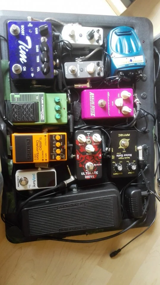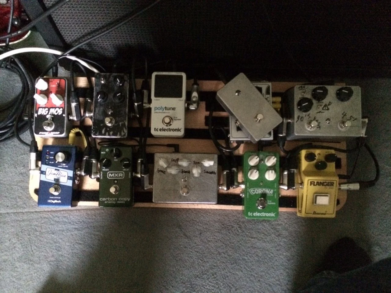 Hab mein Board heute mal rein optisch überarbeitet, mit ner schönen Holzverkleidung 🙂 Darunter verbegen sich unter anderem ganz rechts vorne ein Mooer Green Mile, ein MXR Micro Amp und ein AMT E1 sowie Anschluss- und Umschaltmöglichkeiten für meine Tele und meine 2-kanalige Akustik, die zum Teil mit durch die Effekte läuft, zum Teil dran vorbei 🙂