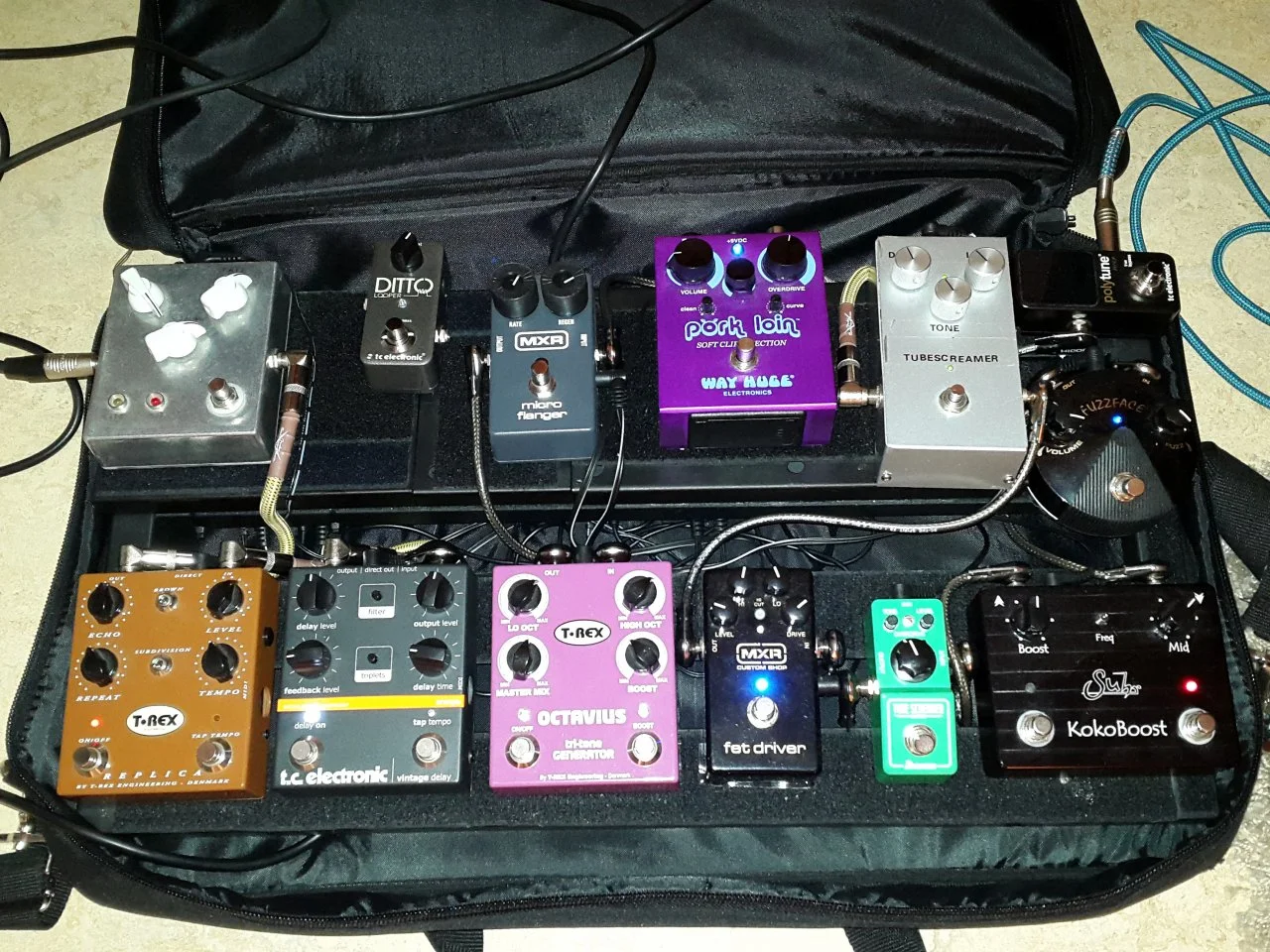 Hier mein aktuelles Board: Lehle Sunday Driver Buffer,RMC 10 Wah, Okko Coca Comp., Vemuram Jan Ray, Roland CE1, Roger Mayer Voodoo Vibe, DTS 3KP Preamp, Eventide Timefactor
