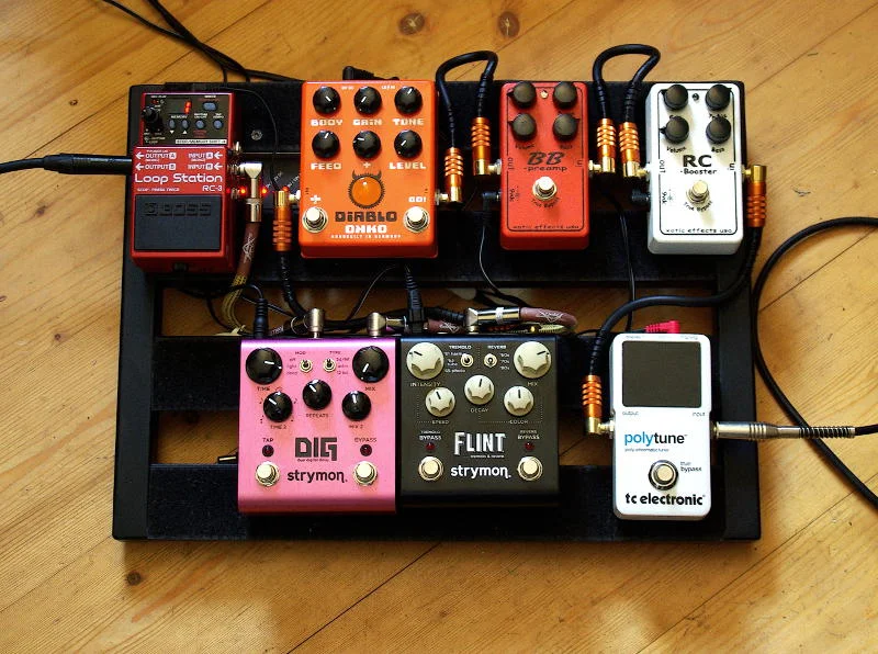 Reihenfolge (auch wenn optisch ersichtlich): T-Rex Tapster Tremolo <-- Budda Karma Chorus <-- Visual Sound Route66 V3 <--
