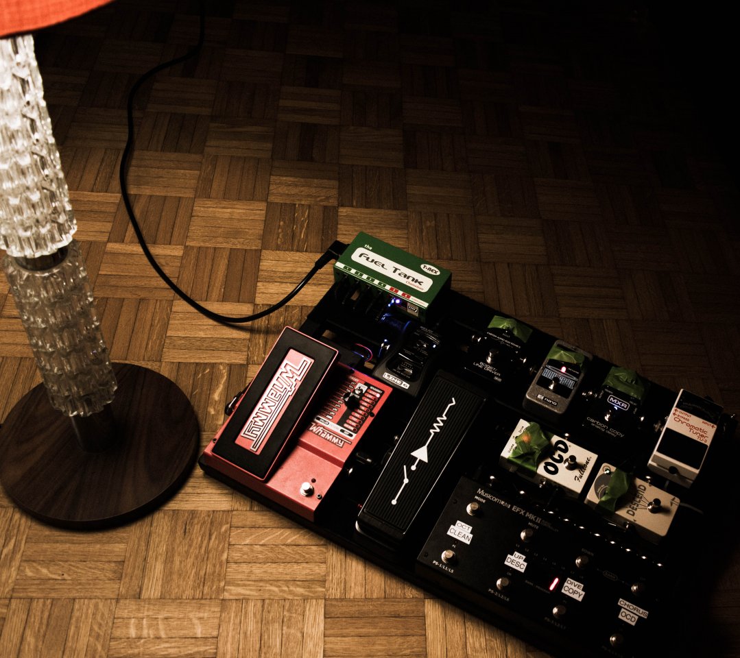 Reihenfolge (auch wenn optisch ersichtlich): T-Rex Tapster Tremolo <-- Budda Karma Chorus <-- Visual Sound Route66 V3 <-- Korg DT 10
